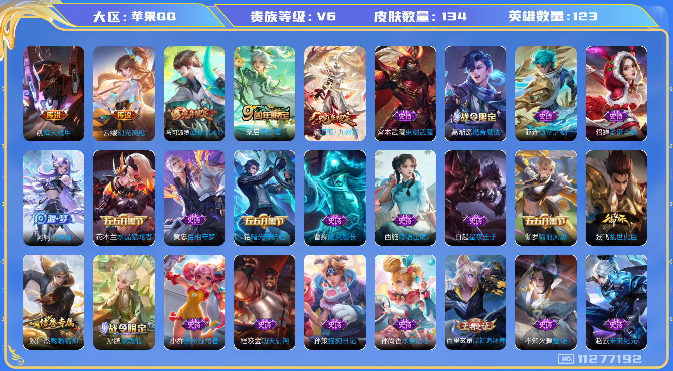 [11277192]V6 4传说 123英雄 134皮肤 可修改实名 优质装备:绛天战甲(鸡嘴战神) 传说皮:幻光神枪 珍宝阁皮:女武神 限定皮:愿照·九州拓(澜年限),鸣野蒿,山海·玄木吟(马可年限) 史诗皮:鸭鸭历险记-刘禅,器灵·浮梦炉,化蝶舞,茶境仙,破空之剑,百相守梦-黄忠,特工魅影,高渐离燃音魔法,魅语,猫狗日记-孙策,乱世虎臣,女仆咖啡,水果甜心,星夜王子,功夫厨神,幽灵船长,鬼剑武藏,乐园奇幻夜,诗语江南,缤纷独角兽,逐浪之夏,水晶猎龙者,曙光守护者,箭羽风息,金属风暴,原初追逐者,圣诞狂欢,圣诞恋歌,鹰眼统帅,未来纪元-赵云