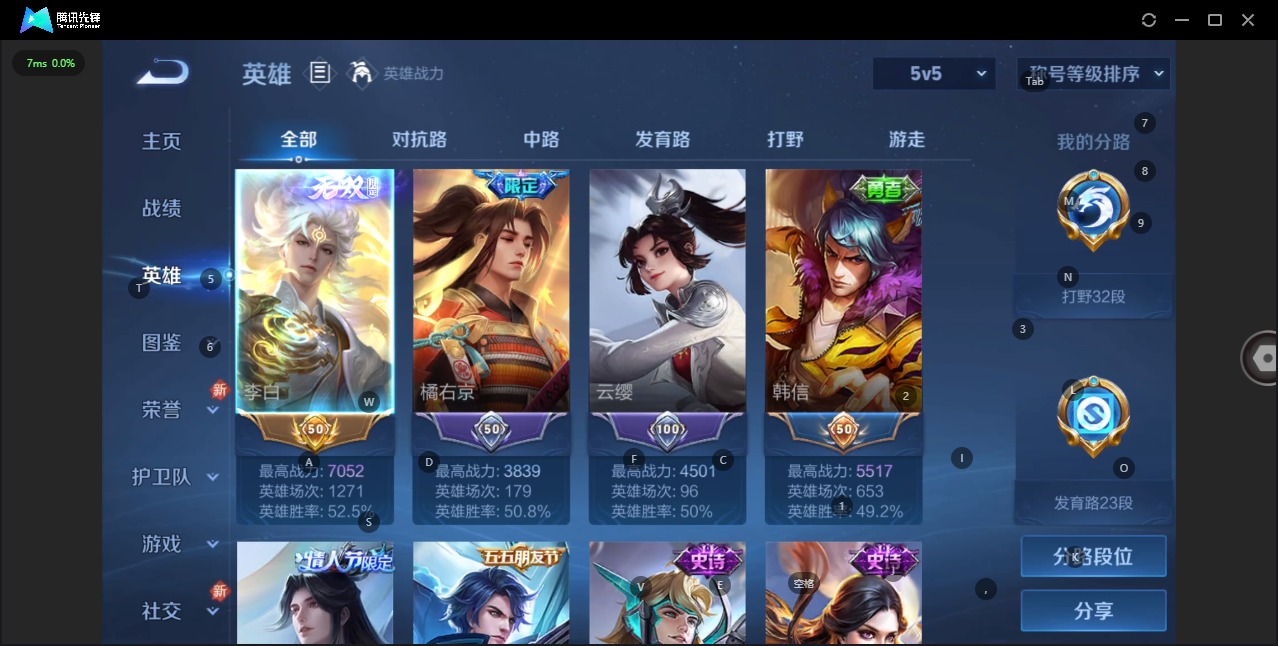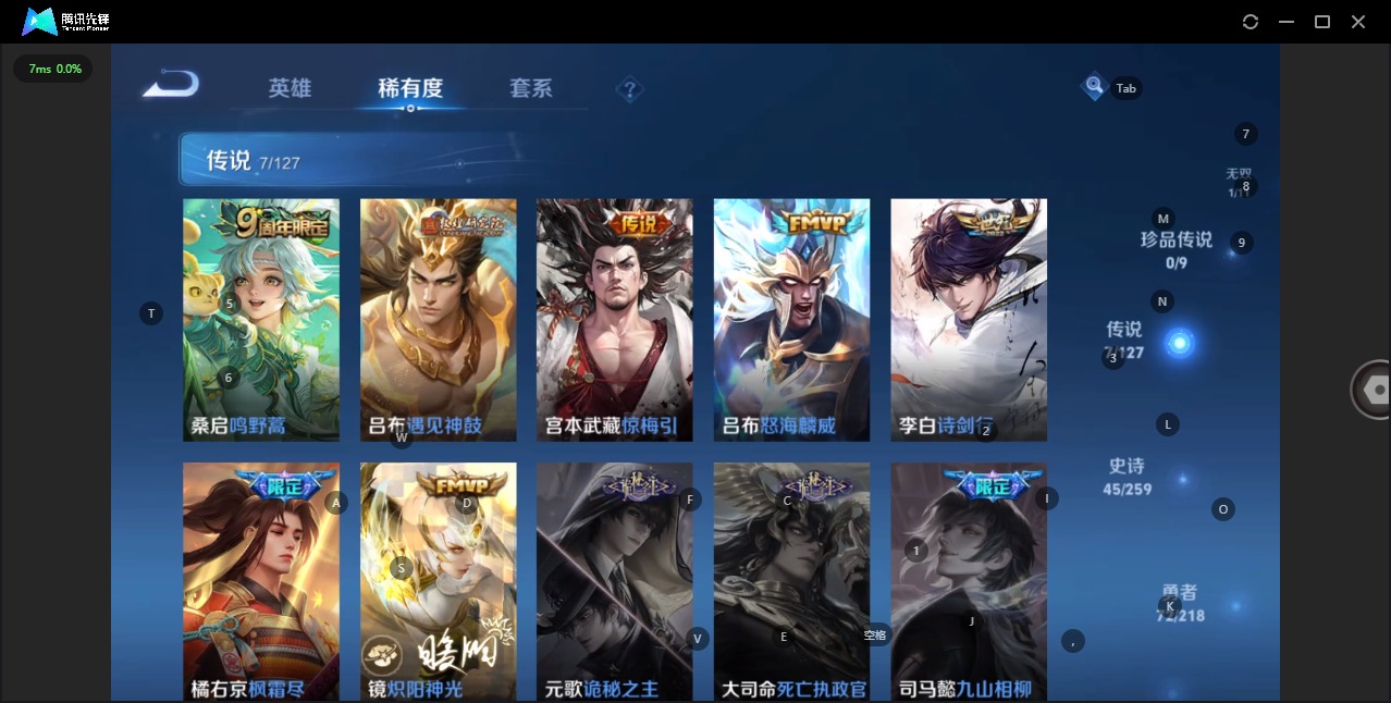 - [12148658]V6 1珍品传说 4传说 72英雄 71皮肤 可修改实名 优质装备:怪盗基德,云鹰飞将(小将军),炽阳神光,霜月吟,涂山容容 传说皮:祥瑞亨通 限定皮:大圣娶亲 史诗皮:化蝶舞,茶境仙,百相守梦-黄忠,遇见神鹿,黄金分割率,偶像歌手,节奏热浪,水果甜心,绅士熊喵,鬼剑武藏,心灵战警,原初追逐者,鹰眼统帅,魅力维加斯