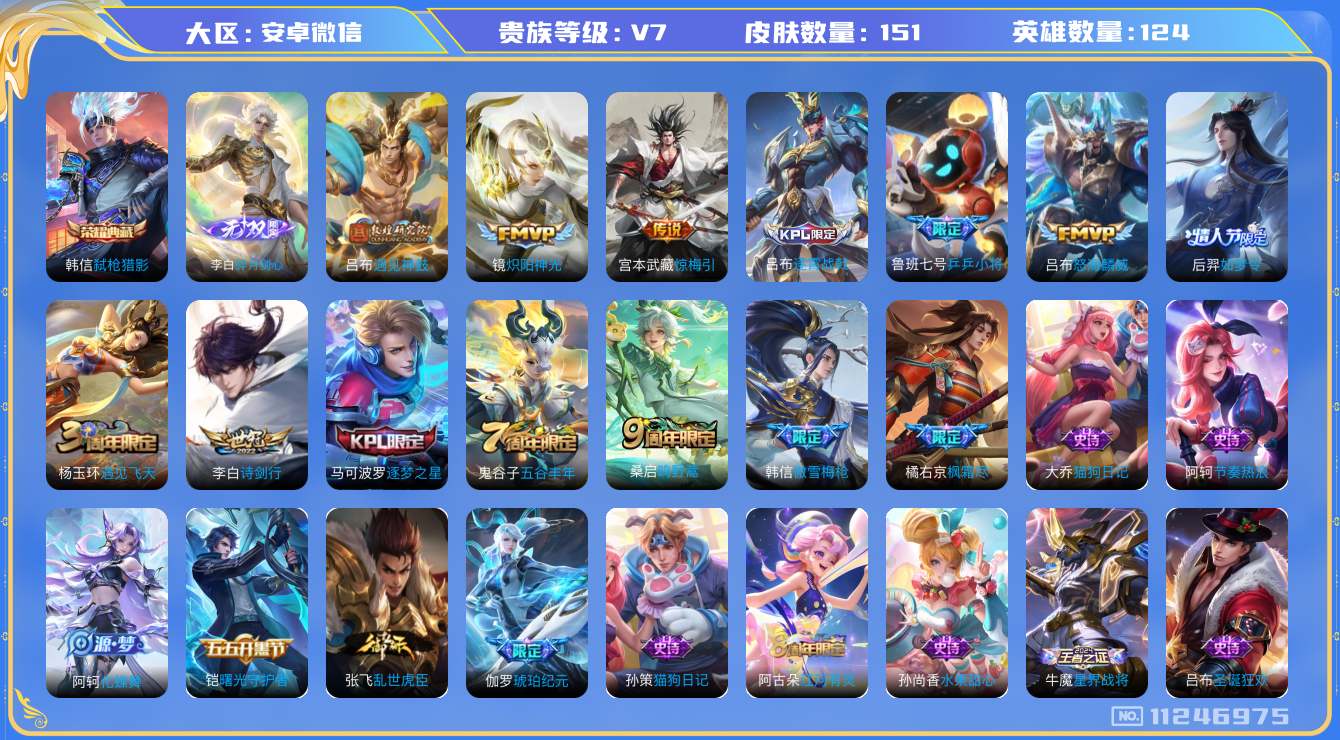 [11246975]V7 1典藏 1无双 7传说 124英雄 151皮肤 可修改实名 安全保护中 优质装备:弑枪猎影(韩信典藏),碎月剑心(李白无双),炽阳神光,惊梅引,遇见神鼓 珍宝阁皮:玩趣恶龙 限定皮:逐霄战戟,鸣野蒿,傲雪梅枪,遇见飞天,诗剑行,怒海麟威,五谷丰年,逐梦之星,如梦令-后羿,乒乒小将,枫霜尽 史诗皮:化蝶舞,星界战将,龙之律动,东方月初,琥珀纪元伽罗,紫霞仙子,特工魅影,江河有灵,匿光侦查者,末日机甲-莱西奥,百解令(蒙犽),冰冠公主,偶像歌手,猫狗日记-孙策,猫狗日记-大乔,乱世虎臣,节奏热浪,修罗,女仆咖啡,摇滚巨星,水果甜心,心灵骇客,暗隐猎兽者,鬼剑武藏,心灵战警,纤云弄巧,拒霜思,曙光守护者,金属风暴,原初追逐者,圣诞狂欢,圣诞恋歌,鹰眼统帅,赏金猎手,无心,未来纪元-赵云