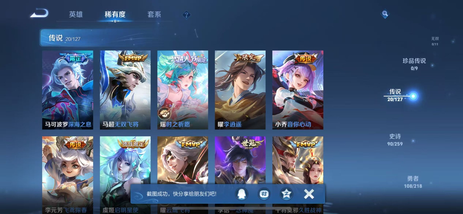 大乔白鹤梁神女,伽罗天狼溯光者,苏烈玄武志,孙膑寅虎·展翼,后羿辉光之辰,公孙离蜜橘之夏,裴擒虎李小龙,上官婉儿梁祝,花木兰瑞麟志,花木兰青春决赛季,马可波罗逐梦之星,马可波罗深海之息,芈月白晶晶,孙悟空至尊宝,百里玄策白虎志,马超神威,妲己时之彼端,韩信逐梦之影,百里守约朱雀志,瑶时之祈愿,王昭君凤凰于飞,嫦娥如梦令,关羽冰锋战神