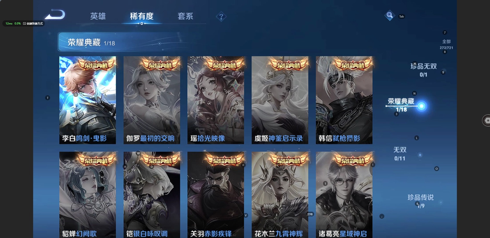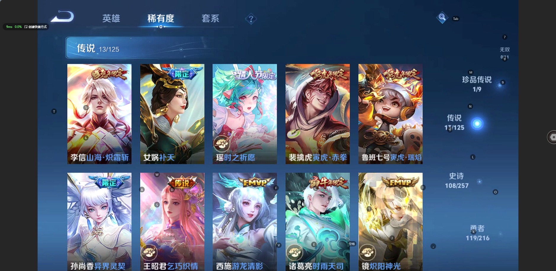 [11252254]V8 1典藏 1珍品传说 13传说 125英雄 272皮肤 可修改实名 荣耀水晶:鸣剑·曳影 珍品传说:怪盗基德 传说皮:游龙清影(小青龙),山海·炽霜斩(李信年限),云鹰飞将(小将军),炽阳神光,乞巧织情,时之恋人-刘备(电焊工) 珍宝阁皮:女武神,玩趣恶龙 限定皮:逐霄战戟,陌上桑,异界灵契(白毛香),补天,寅虎·展翼(孙膑年限),白鹤梁神女,白晶晶,时雨天司(水龙头),神威(电光马子),高山流水,五谷丰年,冰锋战神,游园惊梦,梁祝,逐梦之星,天狼溯光者,李小龙,逐梦之影,朱雀志(守约年限),真爱至上,纯白花嫁,孙行者,猪悟能,一生所爱,大圣娶亲,青春决赛季,云端筑梦师,乒乒小将,蜜橘之夏,匿光追影者,寅虎·御盾(廉颇年限),寅虎·瑞焰(虎皮蛋子),寅虎·心曲(虎婆),寅虎·赤拳(老虎年限),时之祈愿-云中君,时之祈愿-瑶(瑶传限),梦圆繁星 史诗皮:茶境仙,飞车小橘子,龙之律动,雪豹·霜爪,藏狐·褐绒,石田雨龙,百相守梦-百里守约,超元猎域,化蝶舞,紫霞仙子,苍穹之光,电玩小子(小书包),白龙吟,黄金分割率,特工魅影,千年之狐,江河有灵,高渐离燃音魔法,冰冠公主,偶像歌手,晚萤,魅语,电玩·爆裂旋风,暗夜猫娘,末日机甲-吕布,猫狗日记-孙策,猫狗日记-大乔,时之恋人-孙尚香,乱世虎臣,节奏热浪,修罗,女仆咖啡,摇滚巨星,水果甜心,绅士熊喵,天才门将,星夜王子,心灵骇客,时之奇旅-安琪拉,功夫厨神,德古拉伯爵,暗隐猎兽者,幽灵船长,鬼剑武藏,暗渊魔法,心灵战警,乐园奇幻夜,天秀·启明,舞动绿茵,地狱岩魂,纤云弄巧,繁星吟游(呼啦呼啦),拒霜思,缤纷独角兽,乘风破浪,逐浪之夏,月团寄思,水晶猎龙者,曙光守护者,箭羽风息,金属风暴,圣诞狂欢,圣诞恋歌,鹰眼统帅,暗夜贵公子,雪上飞焰,寅虎·御盾,无心,未来纪元-赵云