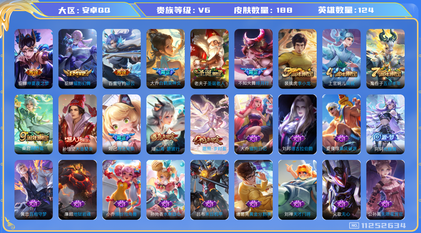 [11252634]V6 6传说 124英雄 188皮肤 可修改实名 女号 优质装备:猫影幻舞,仲夏夜之梦(大飞蛾),碎云 珍宝阁皮:蔷薇恋人 限定皮:愿照·岁时盈(虞姬年限),鸣野蒿,绯月行,白鹤梁神女,山海·碧波行(瑶年限),五谷丰年,梁祝,李小龙,圣诞老人,大圣娶亲,时之奇旅-妲己 史诗皮:化蝶舞,百相守梦-黄忠,遇见神鹿,黄金分割率,无限星赏官,冰冠公主,末日机甲-吕布,猫狗日记-大乔,女仆咖啡,摇滚巨星,水果甜心,天才门将,德古拉伯爵,舞动绿茵,地狱岩魂,繁星吟游(呼啦呼啦),缤纷独角兽,乘风破浪,逐浪之夏,水晶猎龙者,金属风暴,原初追逐者,圣诞恋歌,鹰眼统帅,魅力维加斯,滕王阁序,无心