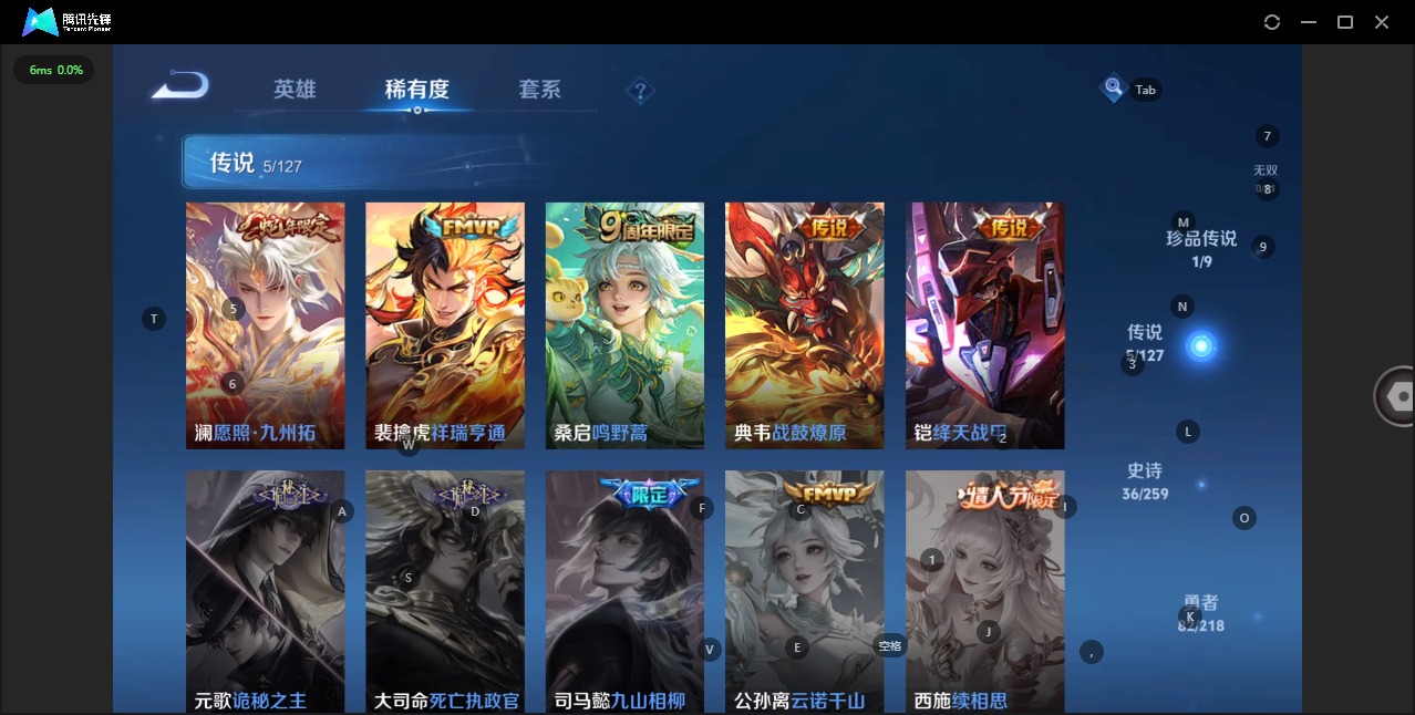 - [11605609]V6 3传说 123英雄 162皮肤 可修改实名 优质装备:神器·狴犴令 珍宝阁皮:蔷薇恋人,玩趣恶龙 限定皮:愿照·九州拓(澜年限),鸣野蒿,遇见飞天,五谷丰年,烈魂,天狼征服者,李小龙,逐梦之影,山海·玄木吟(马可年限) 史诗皮:化蝶舞,龙之律动,雪豹·霜爪,茶境仙,怒海争锋,电玩小子(小书包),特工魅影,江河有灵,蒙恬荣光圣徽,偶像歌手,末日机甲-吕布,节奏热浪,摇滚巨星,水果甜心,绅士熊喵,天才门将,星夜王子,心灵骇客,功夫厨神,德古拉伯爵,幽灵船长,鬼剑武藏,心灵战警,地狱岩魂,缤纷独角兽,逐浪之夏,水晶猎龙者,金属风暴,原初追逐者,圣诞狂欢,鹰眼统帅,魅力维加斯,黎明之约,未来纪元-赵云