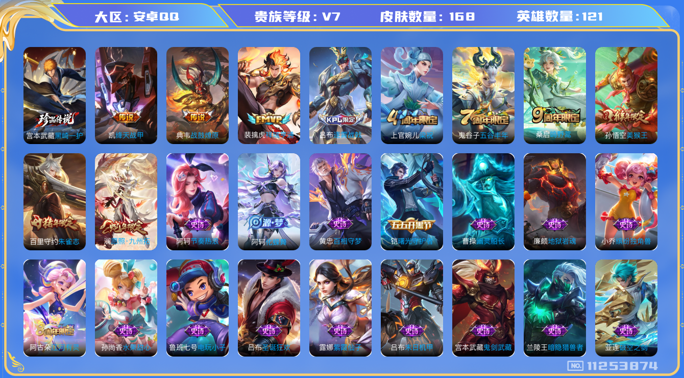 [11253874]V7 1珍品传说 5传说 121英雄 168皮肤 可修改实名 优质装备:黑崎一护,绛天战甲(鸡嘴战神) 传说皮:典韦战鼓燎原,祥瑞亨通 珍宝阁皮:妄想食味 限定皮:愿照·九州拓(澜年限),逐霄战戟,鸣野蒿,五谷丰年,梁祝,朱雀志(守约年限),美猴王 史诗皮:化蝶舞,龙之律动,雪豹·霜爪,破空之剑,百相守梦-百里守约,百相守梦-黄忠,紫霞仙子,电玩小子(小书包),特工魅影,江河有灵,偶像歌手,末日机甲-吕布,节奏热浪,水果甜心,心灵骇客,暗隐猎兽者,幽灵船长,鬼剑武藏,地狱岩魂,缤纷独角兽,逐浪之夏,水晶猎龙者,曙光守护者,圣诞狂欢,圣诞恋歌,鹰眼统帅,魅力维加斯,赏金猎手,未来纪元-赵云