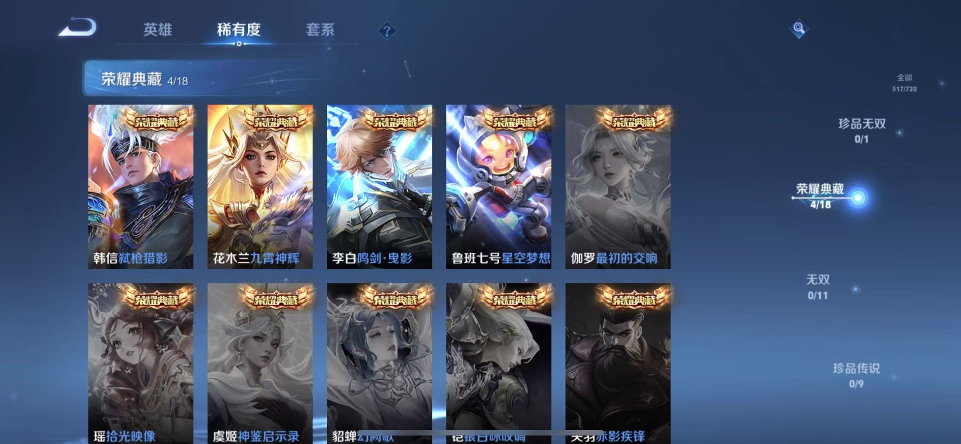 夏侯惇朔风刀,老夫子醍醐杖,沈梦溪星空之诺,沈梦溪大漠名商,盾山御銮,曹操烛龙,苏烈千军破阵,典韦穷奇,达摩沙漠行僧,牛魔御旌,项羽苍威无极,镜青焰无极,兰陵王金庭之子,裴擒虎擒涛扼浪,鲁班大师探海日志,明世隐疑决卦,马可波罗暗影游猎,白起狰,鬼谷子原初探秘者,张良古海寻踪,桑启海盐诗旅,狄仁杰万华元夜,芈月重明,程咬金演武夺筹,李元芳银河之约,李元芳云中旅人,弈星混沌棋,米莱狄御霄,钟馗神迹守卫,钟馗驱傩正仪,狂铁御狮,太乙真人饕餮