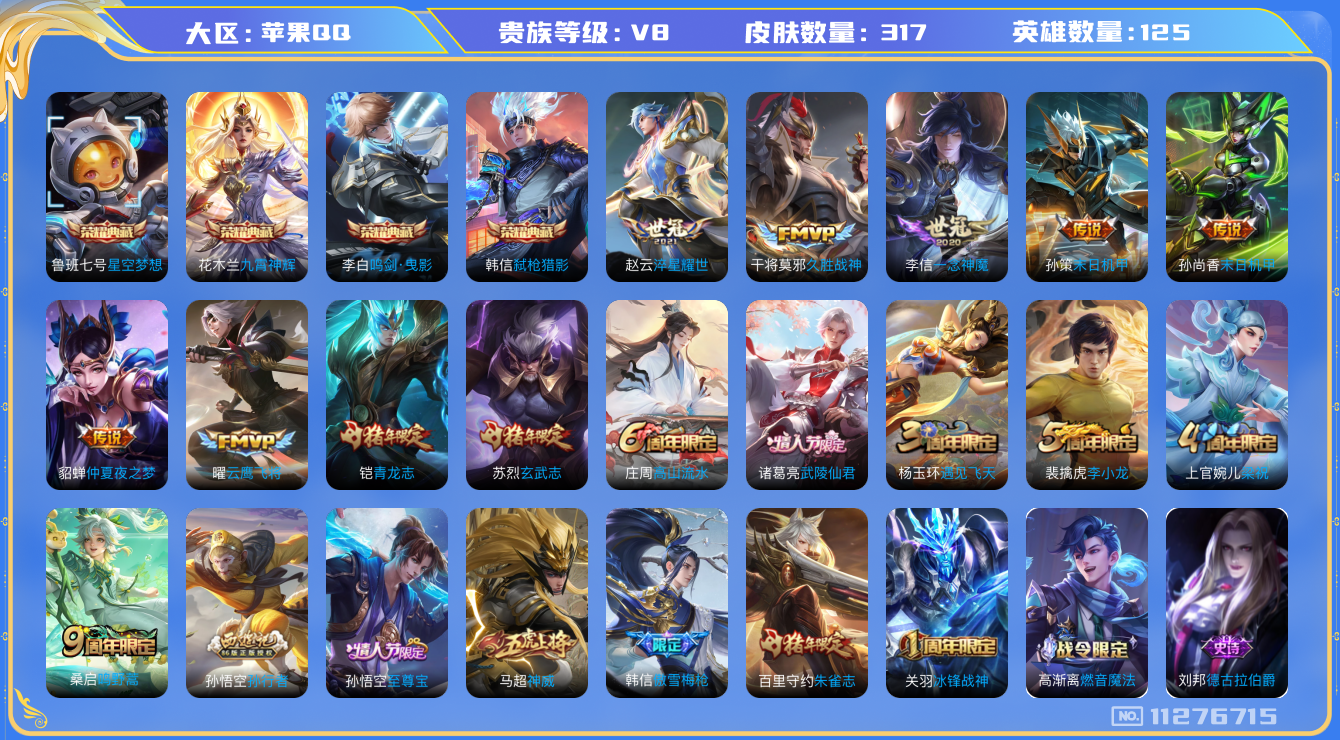 - [12091467]V8 1典藏 1珍品传说 18传说 125英雄 323皮肤 可修改实名 优质装备:九霄神辉(木兰典藏),黑崎一护,黄金狮子座,云鹰飞将(小将军),绛天战甲(鸡嘴战神),黄金白羊座,炽阳神光,一念神魔,地狱火,地狱之眼,超时空战士-狄仁杰,末日机甲-孙策,山海·炽霜斩(李信年限),涂山容容 传说皮:九山相柳,幻光神枪 珍宝阁皮:万物之道,蔷薇恋人,玩趣恶龙 限定皮:愿照·九州拓(澜年限),愿照·岁时盈(虞姬年限),逐霄战戟,鸣野蒿,白晶晶,时雨天司(水龙头),高山流水,五谷丰年,梁祝,御风骁将(吕布年限),虎魄,李小龙,圣诞老人,冰霜恋舞曲 史诗皮:鸭鸭历险记-刘禅,器灵·浮梦炉,化蝶舞,星界战将,龙之律动,石田雨龙,百相守梦-周瑜,茶境仙,战舞者,百相守梦-百里守约,百相守梦-黄忠,织梦人,紫霞仙子,电玩小子(小书包),白龙吟,黄金分割率,江河有灵,百解令(蒙犽),蒙恬荣光圣徽,冰冠公主,青蛇,末日机甲-吕布,猫狗日记-大乔,乱世虎臣,节奏热浪,修罗,女仆咖啡,摇滚巨星,水果甜心,绅士熊喵,天才门将,星夜王子,心灵骇客,功夫厨神,德古拉伯爵,暗隐猎兽者,幽灵船长,鬼剑武藏,暗渊魔法,心灵战警,乐园奇幻夜,天秀·启明,舞动绿茵,地狱岩魂,纤云弄巧,繁星吟游(呼啦呼啦),拒霜思,缤纷独角兽,逐浪之夏,水晶猎龙者,曙光守护者,箭羽风息,金属风暴,原初追逐者,圣诞狂欢,圣诞恋歌,鹰眼统帅,暗夜贵公子,魅力维加斯,黎明之约,天秀·音浪,无心,未来纪元-赵云