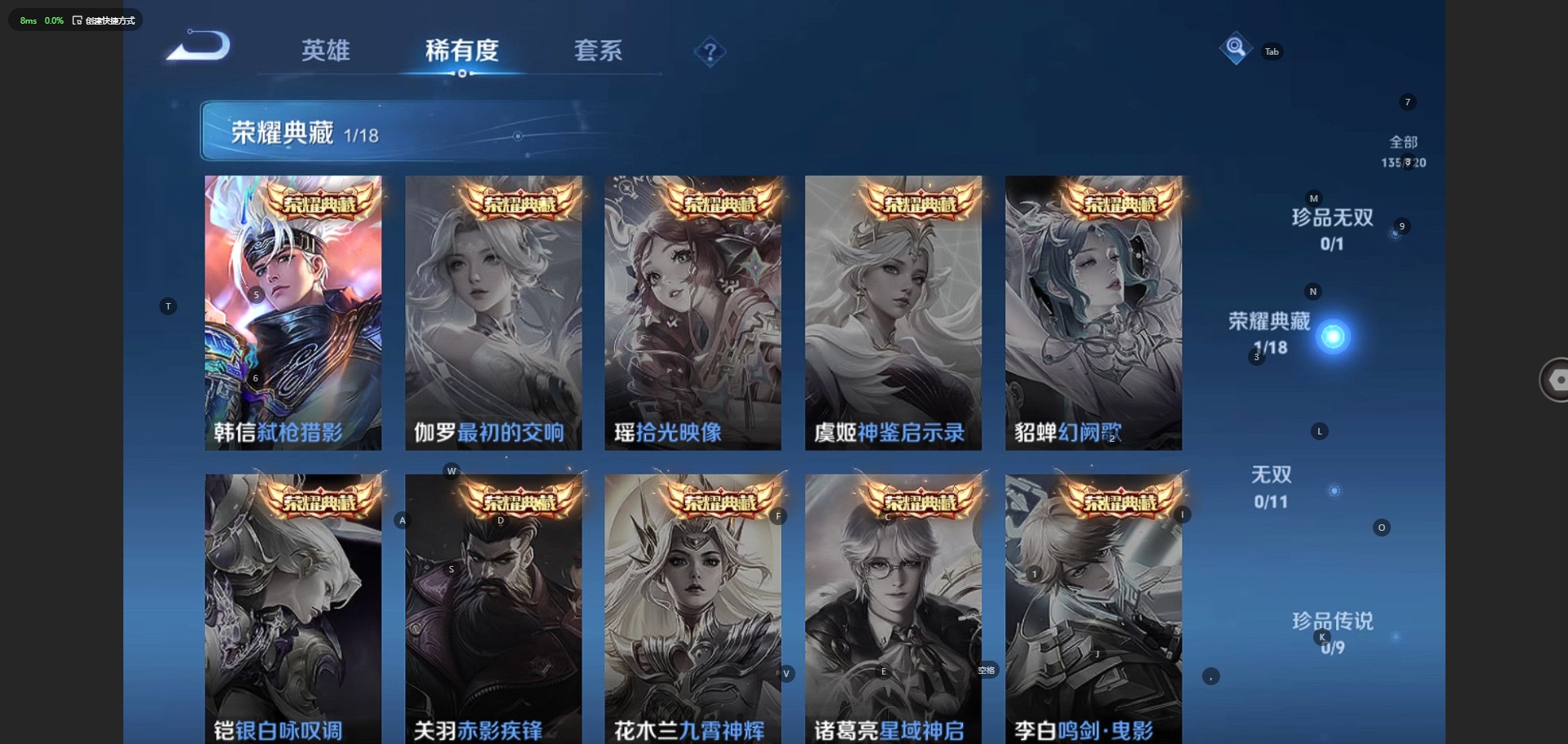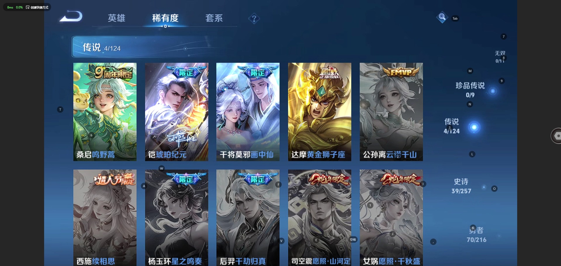 - [11658319]V5 5传说 123英雄 172皮肤 可修改实名 传说皮:吕布曦玄引,幻光神枪,黄金射手座 珍宝阁皮:妄想食味,胡桃夹子 限定皮:愿照·九州拓(澜年限),鸣野蒿,五谷丰年,李小龙 史诗皮:星界战将,器灵·浮梦炉,战舞者,蒙犽顽岩魄,破空之剑,紫霞仙子,黄金分割率,特工魅影,千年之狐,江河有灵,蒙恬荣光圣徽,青蛇,偶像歌手,电玩·爆裂旋风,末日机甲-吕布,猫狗日记-孙策,猫狗日记-大乔,时之恋人-孙尚香,节奏热浪,修罗,女仆咖啡,水果甜心,绅士熊喵,天才门将,心灵骇客,功夫厨神,德古拉伯爵,幽灵船长,鬼剑武藏,心灵战警,舞动绿茵,地狱岩魂,缤纷独角兽,乘风破浪,逐浪之夏,月团寄思,水晶猎龙者,金属风暴,原初追逐者,圣诞狂欢,圣诞恋歌,鹰眼统帅,魅力维加斯,无心,未来纪元-赵云