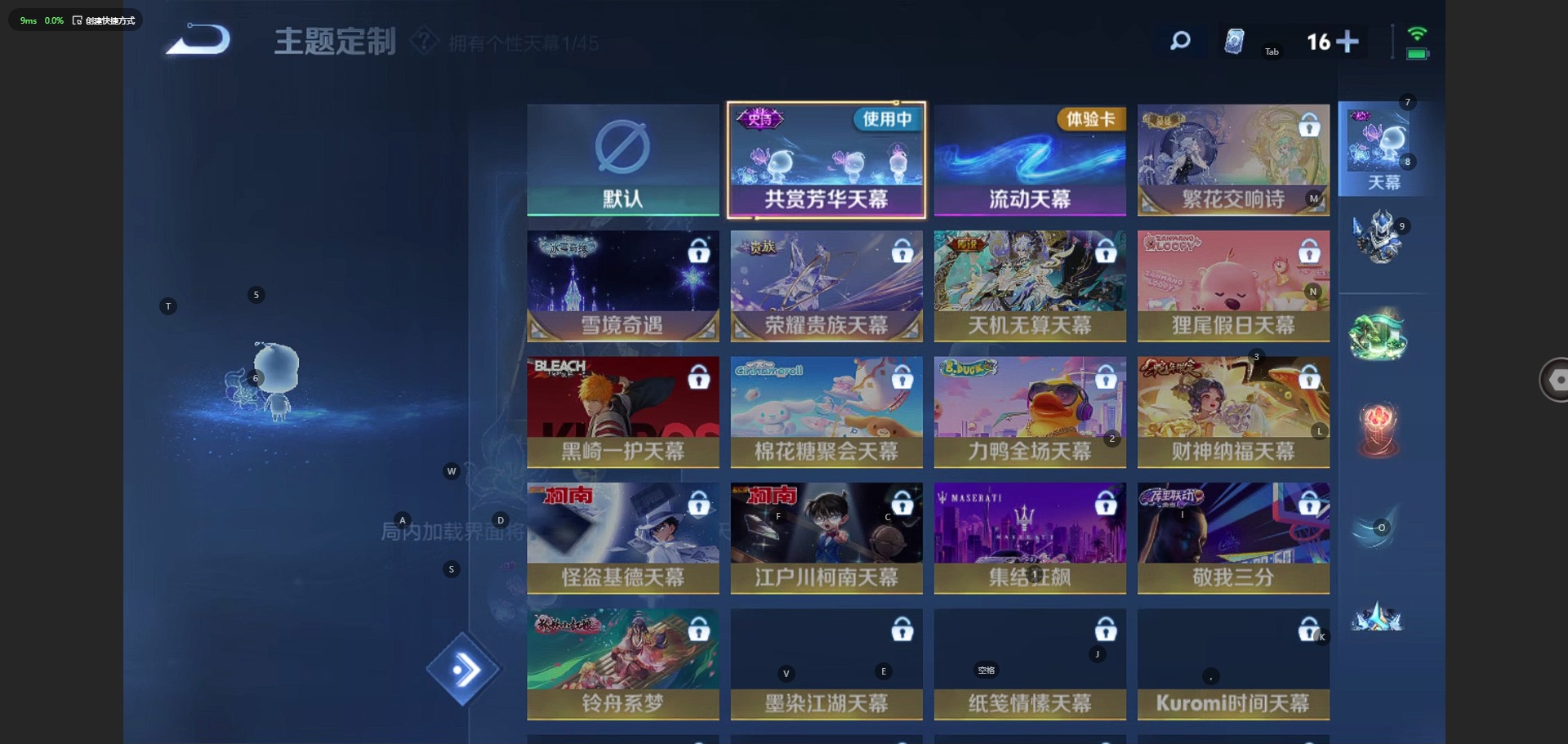 夏侯惇乘风破浪,铠曙光守护者,孙策猫狗日记,不知火舞魅语,露娜紫霞仙子,诸葛亮黄金分割率,刘禅绅士熊喵,宫本武藏鬼剑武藏,公孙离无限星赏官,貂蝉圣诞恋歌,花木兰水晶猎龙者,李白千年之狐,杨戬天秀·启明,白起星夜王子,李元芳逐浪之夏,墨子金属风暴,澜赏金猎手,王昭君偶像歌手