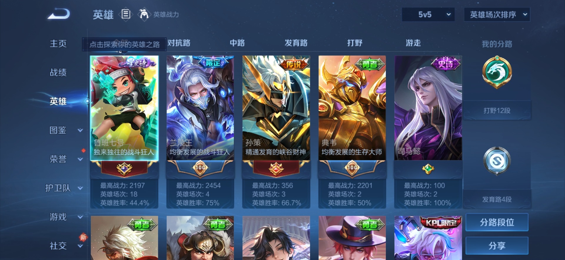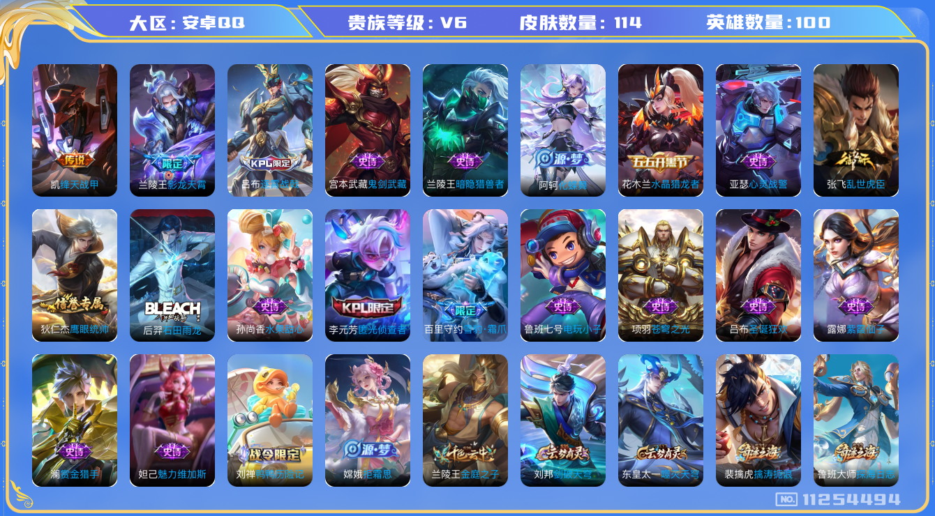 - PX_2103263-实名: 可修改 贵族等级: V9 英雄数: 125 皮肤数: 353 荣耀水晶: 全息碎影,星域神启,银白咏叹调 珍品传说: 朽木白哉,黑崎一护 传说皮: 黄金射手座,猫影幻舞,末日机甲-孙尚香,零号·赤焰,地狱之眼,音你心动-周瑜,乞巧织情,山海·苍雷引,浮生妄,幻光神枪 限定皮: 冰锋战神,李小龙,游园惊梦,梁祝,引擎之心,天狼溯光者,青龙志,朱雀志,至尊宝,武陵仙君,大