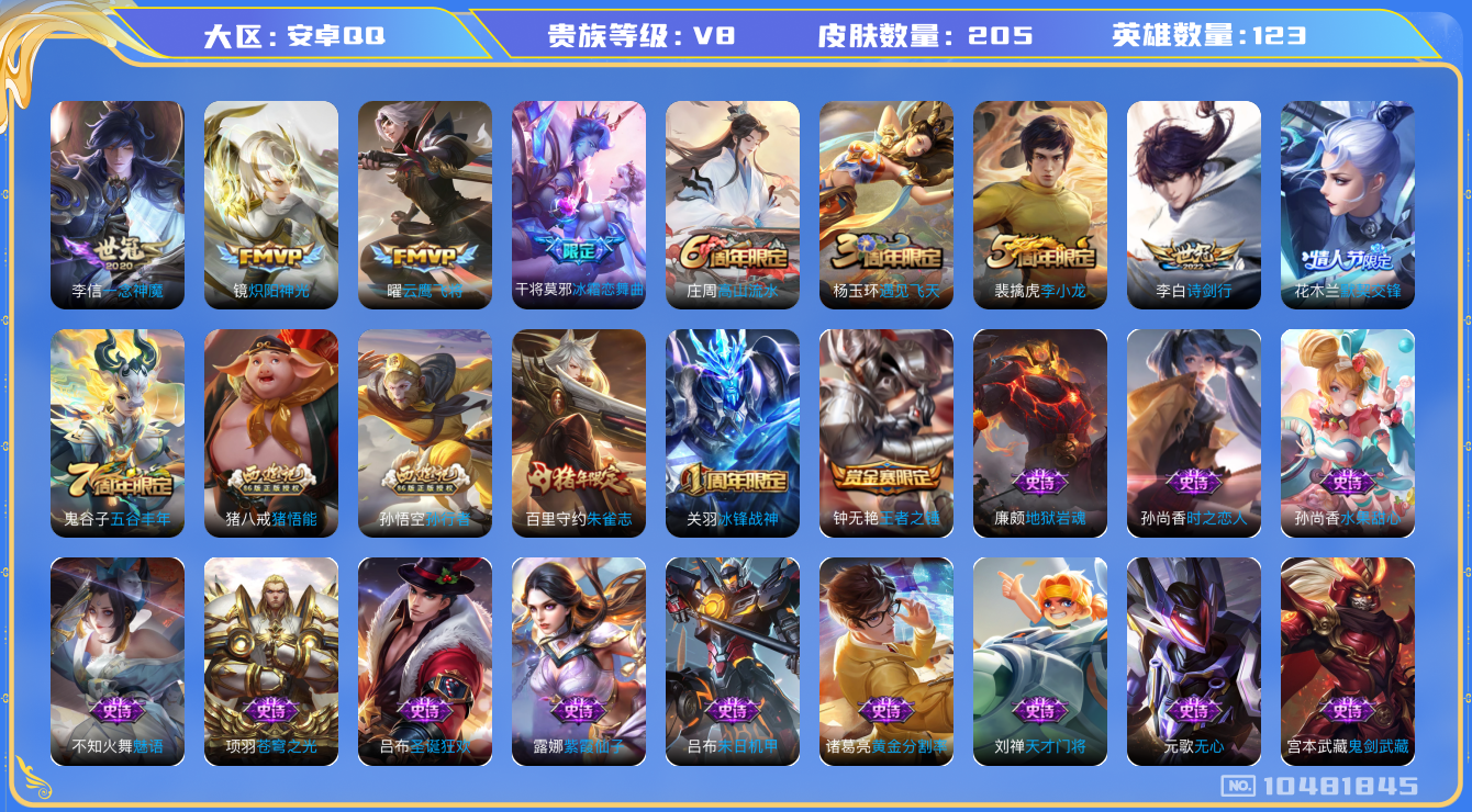 [10481845]V8 5传说 123英雄 205皮肤 可修改实名 传说皮:一念神魔,云鹰飞将(小将军),炽阳神光 珍宝阁皮:万物之道,蔷薇恋人 限定皮:遇见飞天,高山流水,诗剑行,五谷丰年,冰锋战神,李小龙,朱雀志(守约年限),默契交锋-花木兰,孙行者,猪悟能,冰霜恋舞曲 史诗皮:紫霞仙子,苍穹之光,黄金分割率,百解令(蒙犽),偶像歌手,魅语,末日机甲-吕布,时之恋人-孙尚香,修罗,水果甜心,天才门将,星夜王子,鬼剑武藏,舞动绿茵,地狱岩魂,诗语江南,拒霜思,逐浪之夏,水晶猎龙者,热力回旋,唤灵魅影,金属风暴,圣诞狂欢,圣诞恋歌,鹰眼统帅,王者之锤,魅力维加斯,黎明之约,无心