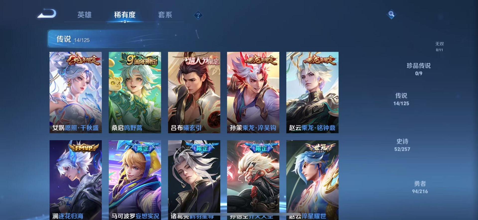 大乔猫狗日记,高渐离燃音魔法,夏侯惇乘风破浪,阿轲暗夜猫娘,阿轲节奏热浪,铠曙光守护者,曹操幽灵船长,伽罗箭羽风息,廉颇地狱岩魂,赵怀真器灵·浮梦炉,吕布圣诞狂欢,露娜紫霞仙子,司马懿暗渊魔法,宫本武藏鬼剑武藏,兰陵王暗隐猎兽者,貂蝉圣诞恋歌,花木兰水晶猎龙者,李白千年之狐,蒙犽百解令,白起星夜王子,嬴政摇滚巨星,百里守约特工魅影,李元芳逐浪之夏,墨子金属风暴,王昭君偶像歌手,嫦娥拒霜思