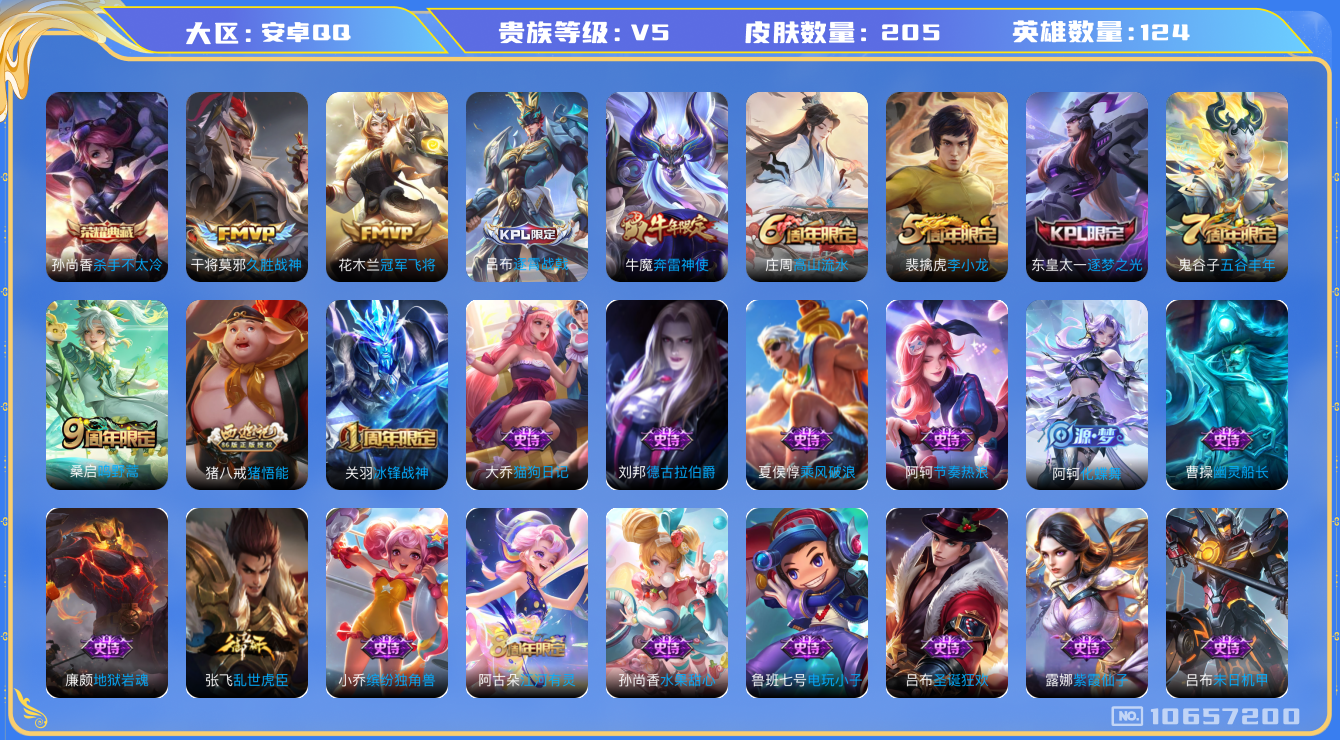 [10657200]V5 1典藏 3传说 124英雄 205皮肤 可修改实名 荣耀水晶:杀手不太冷 传说皮:冠军飞将,久胜战神 珍宝阁皮:妄想食味,蔷薇恋人 限定皮:逐霄战戟,鸣野蒿,高山流水,五谷丰年,冰锋战神,奔雷神使(牛魔年限),李小龙,逐梦之光,猪悟能 史诗皮:化蝶舞,鸭鸭历险记-刘禅,龙之律动,蒙犽顽岩魄,紫霞仙子,电玩小子(小书包),电玩·爆裂旋风,江河有灵,雪夜绮愿(周瑜),百解令(蒙犽),偶像歌手,末日机甲-吕布,猫狗日记-大乔,乱世虎臣,节奏热浪,女仆咖啡,水果甜心,天才门将,星夜王子,功夫厨神,德古拉伯爵,暗隐猎兽者,幽灵船长,鬼剑武藏,心灵战警,舞动绿茵,地狱岩魂,纤云弄巧,拒霜思,缤纷独角兽,乘风破浪,逐浪之夏,水晶猎龙者,金属风暴,原初追逐者,圣诞狂欢,圣诞恋歌,鹰眼统帅,魅力维加斯,无心,未来纪元-赵云