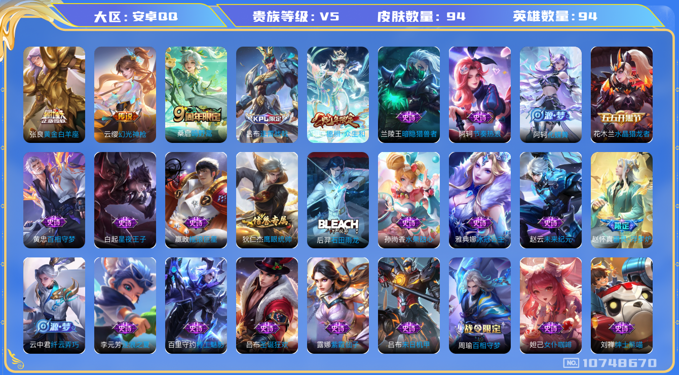 [10748670]V5 4传说 94英雄 94皮肤 可修改实名 传说皮:幻光神枪,黄金白羊座 限定皮:愿照·众生和(妲己年限),逐霄战戟,鸣野蒿 史诗皮:器灵·浮梦炉,龙之律动,石田雨龙,百相守梦-黄忠,战舞者,百相守梦-周瑜,化蝶舞,紫霞仙子,特工魅影,冰冠公主,末日机甲-吕布,节奏热浪,女仆咖啡,摇滚巨星,水果甜心,绅士熊喵,星夜王子,暗隐猎兽者,纤云弄巧,逐浪之夏,水晶猎龙者,圣诞狂欢,鹰眼统帅,未来纪元-赵云