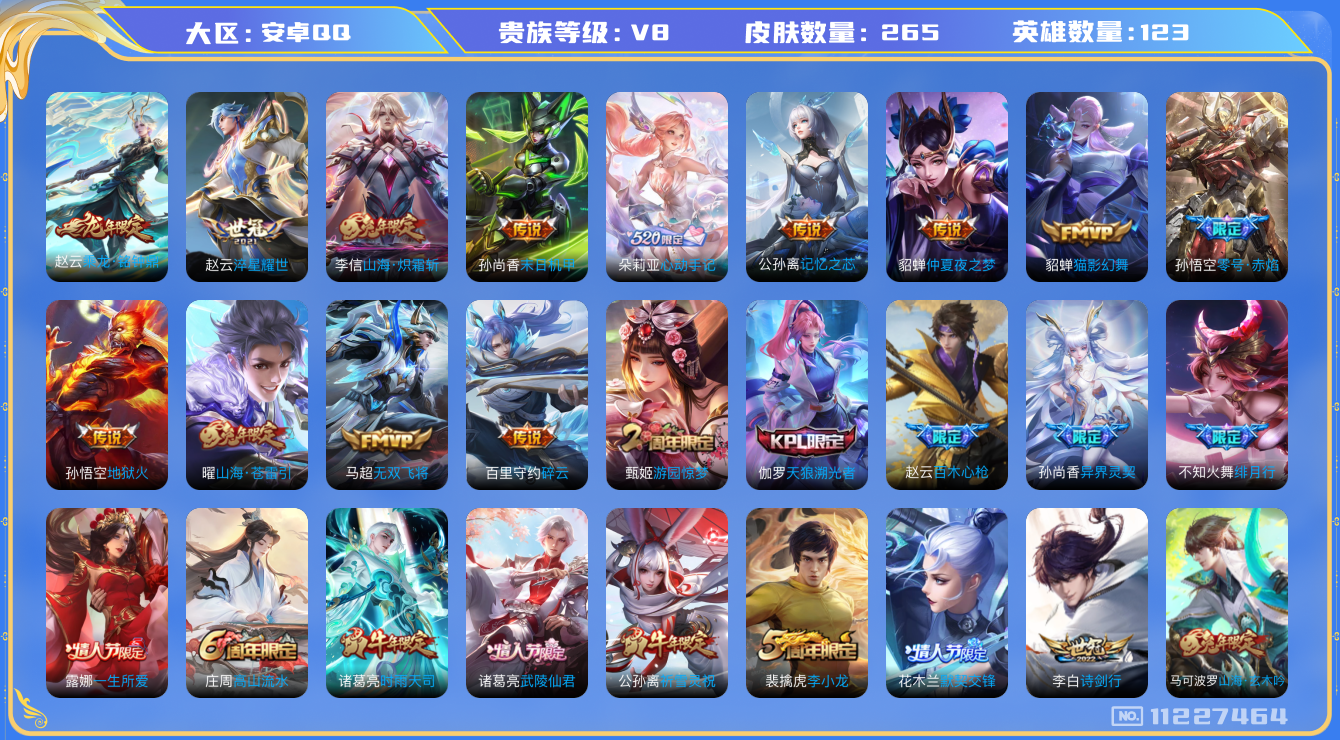 [11227464]V8 22传说 123英雄 265皮肤 可修改实名 女号 传说皮:乘龙·铭钟鼎(赵云年限),朵莉亚心动手记,山海·炽霜斩(李信年限),零号·赤焰,地狱火,仲夏夜之梦(大飞蛾),末日机甲-孙尚香(绿蚂蚱),淬星耀世,猫影幻舞,无双飞将,碎云,山海·苍雷引(电光曜子),记忆之芯(机甲兔) 珍宝阁皮:妄想食味,蔷薇恋人,女武神 限定皮:鸣野蒿,至尊宝,武陵仙君(小桃花),异界灵契(白毛香),绯月行,时雨天司(水龙头),山海·碧波行(瑶年限),至美·乘鲤谣,高山流水,诗剑行,五谷丰年,游园惊梦,天狼溯光者,祈雪灵祝(雪兔子),李小龙,默契交锋-花木兰,孙行者,一生所爱,引擎之心,时之祈愿-瑶(瑶传限),百木心枪,时之奇旅-妲己,山海·玄木吟(马可年限) 史诗皮:星界战将,海诺心动手记,蔬乡物语(鲁班七号),乘龙·聚宝船(安琪拉年限),白龙吟,黄金分割率,特工魅影,千年之狐,江河有灵,蒙恬荣光圣徽,冰冠公主,偶像歌手,无限星赏官,电玩·爆裂旋风,百相守梦(刘备),银翎春语,猫狗日记-大乔,节奏热浪,女仆咖啡,水果甜心,绅士熊喵,星夜王子,心灵骇客,功夫厨神,德古拉伯爵,鬼剑武藏,纤云弄巧,繁星吟游(呼啦呼啦),拒霜思,水晶猎龙者,曙光守护者,箭羽风息,金属风暴,原初追逐者,圣诞恋歌,鹰眼统帅,王者之锤,魅力维加斯,黎明之约,无心,未来纪元-赵云