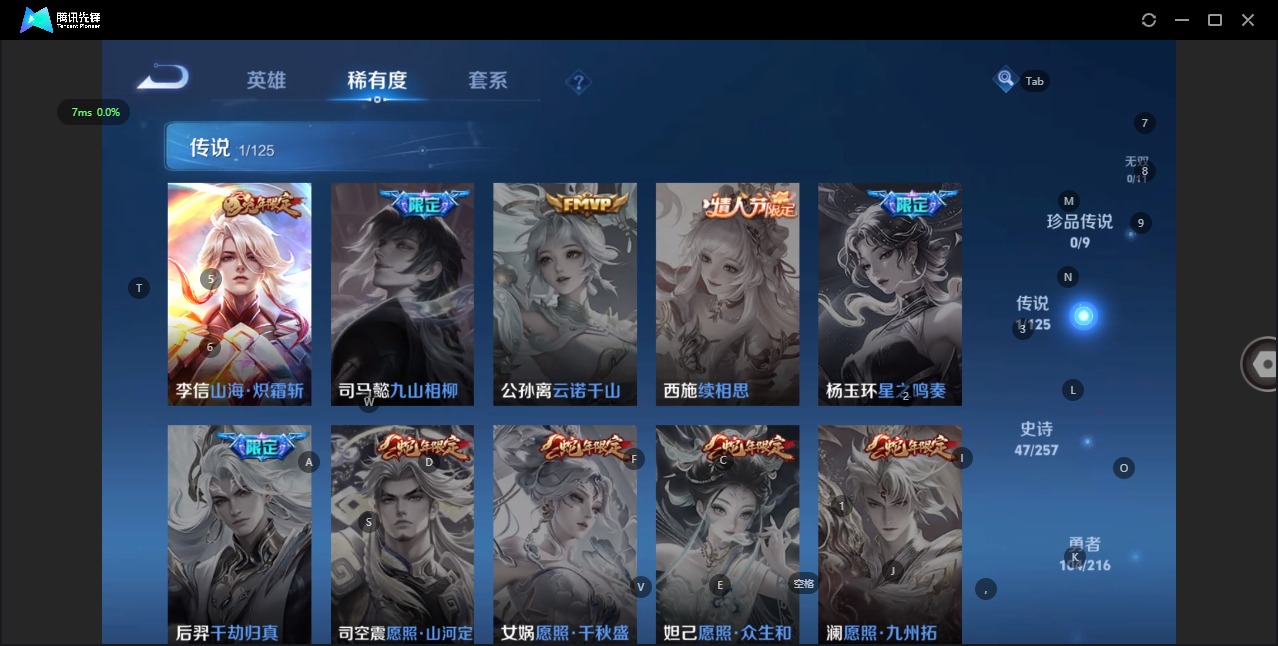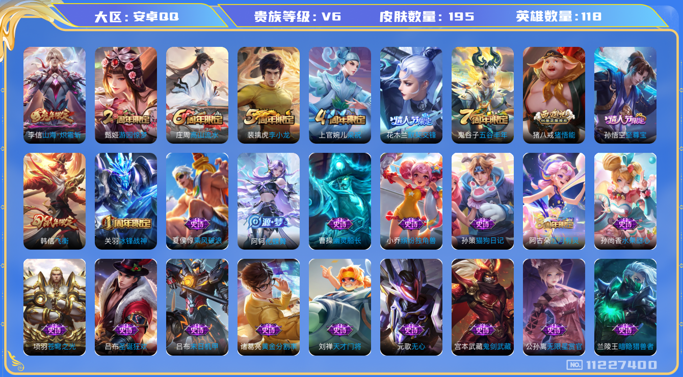 - [12279003]V6 1典藏 7传说 123英雄 181皮肤 可修改实名 优质装备:弑枪猎影(韩信典藏),云霓雀翎,飞鸢探春,神器·狴犴令,涂山容容 传说皮:幻光神枪 珍宝阁皮:蔷薇恋人,女武神,玩趣恶龙 限定皮:愿照·九州拓(澜年限),鸣野蒿,至尊宝,齐天大圣,五谷丰年,游园惊梦,李小龙,如梦令-后羿,孙行者,大圣娶亲 史诗皮:化蝶舞,石田雨龙,茶境仙,蔬乡物语(鲁班七号),百相守梦-黄忠,紫霞仙子,黄金分割率,特工魅影,千年之狐,江河有灵,偶像歌手,末日机甲-吕布,节奏热浪,女仆咖啡,摇滚巨星,水果甜心,绅士熊喵,星夜王子,暗隐猎兽者,幽灵船长,鬼剑武藏,暗渊魔法,心灵战警,舞动绿茵,纤云弄巧,繁星吟游(呼啦呼啦),逐浪之夏,水晶猎龙者,金属风暴,鹰眼统帅,魅力维加斯,无心,未来纪元-赵云