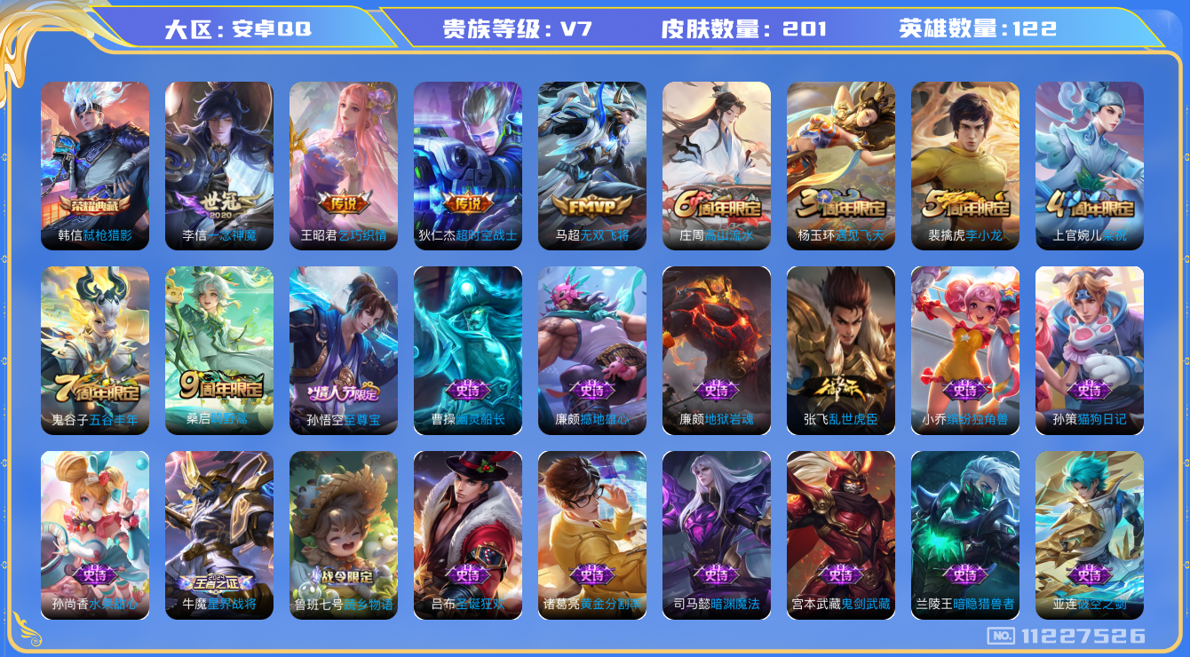 [11227526]V7 1典藏 5传说 122英雄 201皮肤 可修改实名 荣耀水晶:弑枪猎影(韩信典藏) 传说皮:一念神魔,无双飞将,乞巧织情,超时空战士-狄仁杰 珍宝阁皮:胡桃夹子,玩趣恶龙 限定皮:鸣野蒿,至尊宝,遇见飞天,高山流水,五谷丰年,梁祝,李小龙 史诗皮:星界战将,撼地雄心,百相守梦-百里守约,蒙犽顽岩魄,蔬乡物语(鲁班七号),破空之剑,黄金分割率,特工魅影,千年之狐,蒙恬荣光圣徽,猫狗日记-孙策,乱世虎臣,修罗,摇滚巨星,水果甜心,暗隐猎兽者,幽灵船长,鬼剑武藏,暗渊魔法,心灵战警,天秀·启明,地狱岩魂,缤纷独角兽,金属风暴,原初追逐者,圣诞狂欢,鹰眼统帅,黎明之约,奇遇舞章,未来纪元-赵云