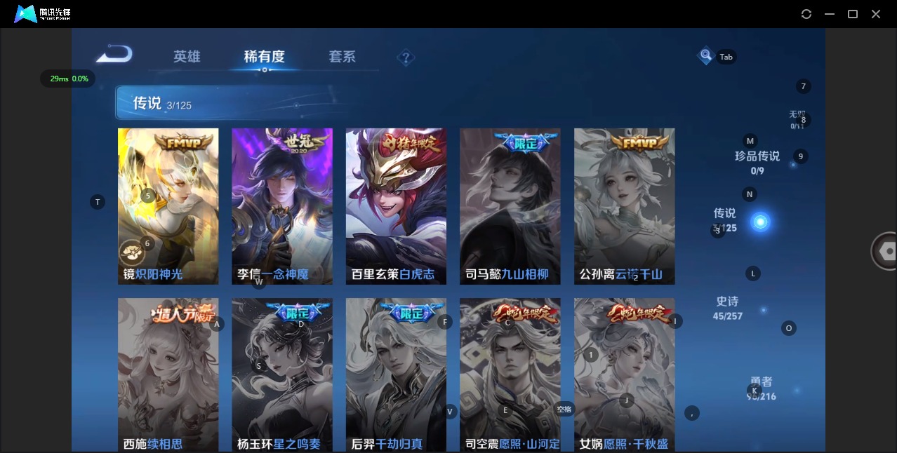 - [11853601]V9 2典藏 14传说 125英雄 281皮肤 典藏英雄武则天 可修改实名 优质装备:天鹅之梦(小乔典藏),杀手不太冷,黄金狮子座,黄金射手座,猫影幻舞,云霓雀翎,末日机甲-孙尚香(绿蚂蚱),地狱火,仲夏夜之梦(大飞蛾),海洋之心,挚爱之约,挚爱花嫁,涂山容容 珍宝阁皮:蔷薇恋人 限定皮:至尊宝,白虎志(电光耗子),梅西,武陵仙君(小桃花),补天,白晶晶,飞衡(韩信年限),瑞麟志(木兰年限),遇见飞天,匿光决锋者,青龙志(铠年限),天狼运算者,梁祝,御风骁将(吕布年限),天狼狩猎者,龙胆,逐梦之翼,天狼绘梦者,李小龙,逐梦之光,玄武志(苏烈年限),朱雀志(守约年限),奇迹圣诞,默契交锋-花木兰,一生所爱,大圣娶亲,青春决赛季,冰霜恋舞曲,云端筑梦师,蜜橘之夏,热情桑巴,神奇女侠,玉兔公主 史诗皮:遇见神鹿,紫霞仙子,电玩小子(小书包),黄金分割率,特工魅影,永昼,魅语,无限星赏官,冰冠公主,偶像歌手,晚萤,暗夜猫娘,猫狗日记-孙策,猫狗日记-大乔,乱世虎臣,节奏热浪,修罗,女仆咖啡,水果甜心,绅士熊喵,天才门将,星夜王子,心灵骇客,功夫厨神,德古拉伯爵,暗隐猎兽者,鬼剑武藏,天秀·启明,舞动绿茵,诗语江南,纤云弄巧,繁星吟游(呼啦呼啦),缤纷独角兽,乘风破浪,逐浪之夏,水晶猎龙者,曙光守护者,箭羽风息,唤灵魅影,圣诞狂欢,圣诞恋歌,鹰眼统帅,暗夜贵公子,魅力维加斯,奇遇舞章,未来纪元-赵云