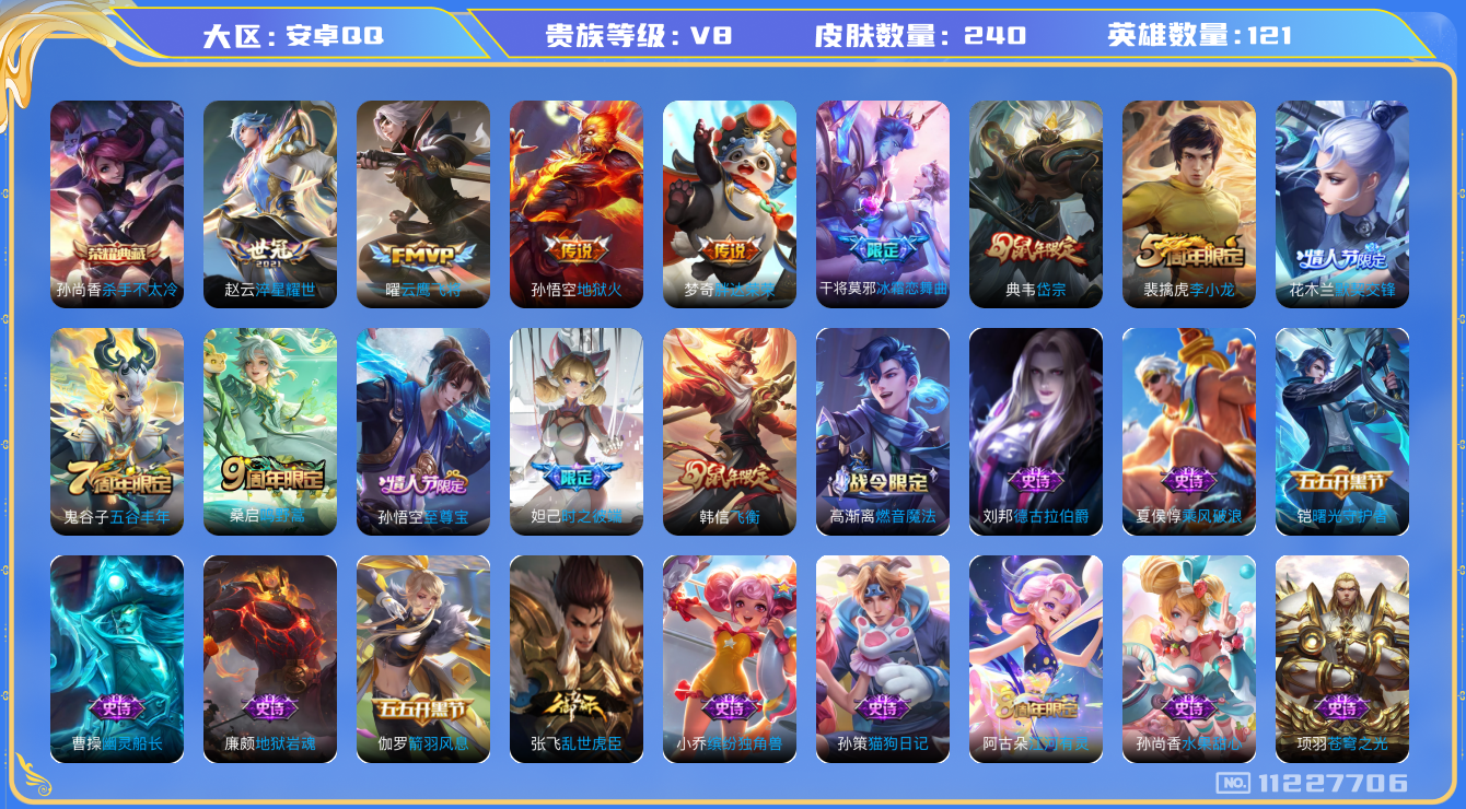 [11227706]V8 1典藏 6传说 121英雄 240皮肤 可修改实名 荣耀水晶:杀手不太冷 传说皮:地狱火,淬星耀世,云鹰飞将(小将军),胖达荣荣 珍宝阁皮:蔷薇恋人,女武神 限定皮:鸣野蒿,至尊宝,时之彼端,飞衡(韩信年限),五谷丰年,岱宗(典韦年限),李小龙,默契交锋-花木兰,冰霜恋舞曲 史诗皮:紫霞仙子,苍穹之光,黄金分割率,特工魅影,千年之狐,江河有灵,高渐离燃音魔法,百解令(蒙犽),蒙恬荣光圣徽,偶像歌手,晚萤,无限星赏官,电玩·爆裂旋风,末日机甲-吕布,猫狗日记-孙策,乱世虎臣,修罗,女仆咖啡,摇滚巨星,水果甜心,天才门将,星夜王子,心灵骇客,时之奇旅-安琪拉,功夫厨神,德古拉伯爵,暗隐猎兽者,幽灵船长,鬼剑武藏,心灵战警,天秀·启明,舞动绿茵,地狱岩魂,纤云弄巧,繁星吟游(呼啦呼啦),缤纷独角兽,乘风破浪,逐浪之夏,水晶猎龙者,曙光守护者,箭羽风息,金属风暴,原初追逐者,圣诞狂欢,圣诞恋歌,鹰眼统帅,无心,未来纪元-赵云