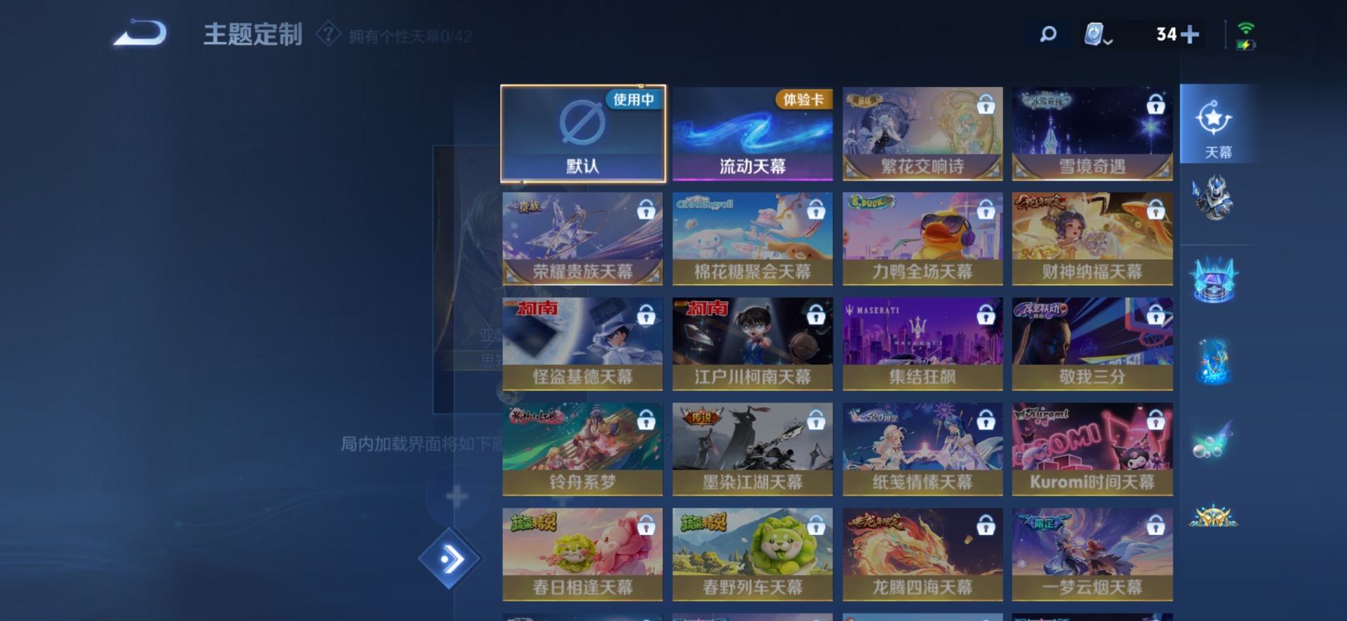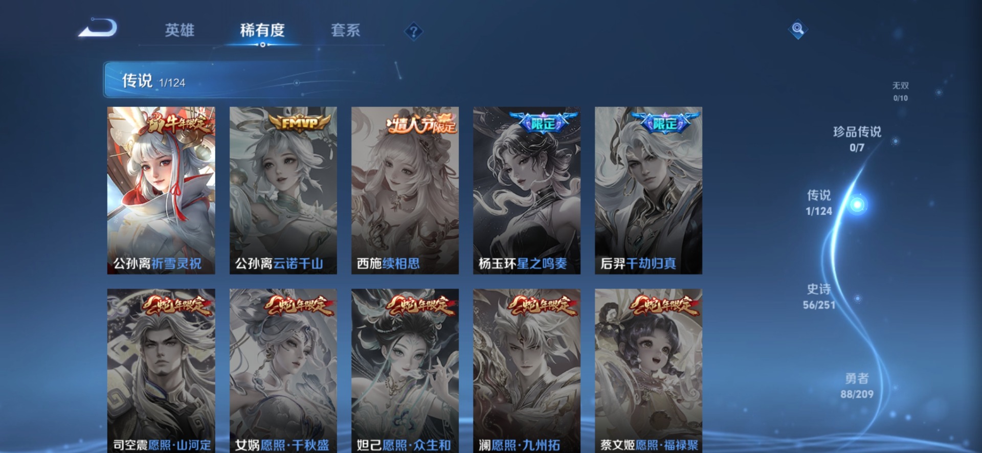 刘邦夺宝奇兵,夏侯惇朔风刀,老夫子醍醐杖,沈梦溪星空之诺,沈梦溪大漠名商,盾山御銮,曹操烛龙,苏烈千军破阵,典韦穷奇,典韦蓝屏警告,达摩沙漠行僧,牛魔御旌,鲁班七号狮舞东方,吕布猎兽之王,元歌云间偶戏,兰陵王金庭之子,明世隐疑决卦,蒙犽狂想玩偶喵,马可波罗暗影游猎,鬼谷子原初探秘者,女娲朔望之晖,桑启海盐诗旅,狄仁杰万华元夜,嬴政白昼王子,芈月重明,程咬金演武夺筹,扁鹊炼金王,李元芳银河之约,李元芳云中旅人,弈星混沌棋,虞姬凯尔特女王,米莱狄御霄,钟馗神迹守卫,钟馗驱傩正仪,狂铁御狮