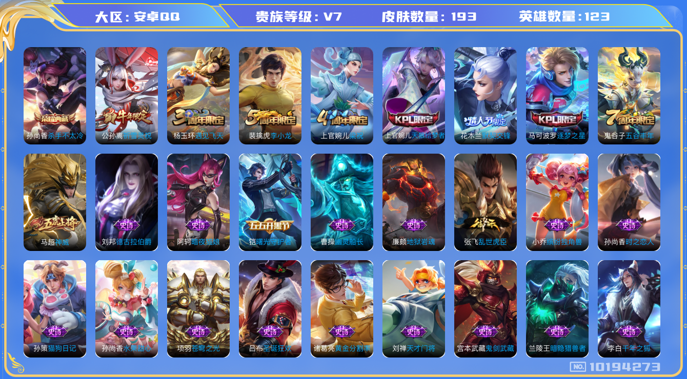 [10194273]V7 1典藏 1传说 123英雄 193皮肤 可修改实名 荣耀水晶:杀手不太冷 珍宝阁皮:女武神,玩趣恶龙 限定皮:神威(电光马子),遇见飞天,五谷丰年,梁祝,逐梦之星,祈雪灵祝(雪兔子),天狼绘梦者,李小龙,默契交锋-花木兰 史诗皮:苍穹之光,白龙吟,黄金分割率,千年之狐,暗夜猫娘,龙骑士(小龙虾),偶像歌手,冰冠公主,猫狗日记-孙策,时之恋人-孙尚香,乱世虎臣,女仆咖啡,摇滚巨星,水果甜心,天才门将,星夜王子,功夫厨神,德古拉伯爵,暗隐猎兽者,幽灵船长,鬼剑武藏,心灵战警,舞动绿茵,地狱岩魂,缤纷独角兽,逐浪之夏,曙光守护者,金属风暴,原初追逐者,圣诞狂欢,鹰眼统帅,魅力维加斯,黎明之约,未来纪元-赵云