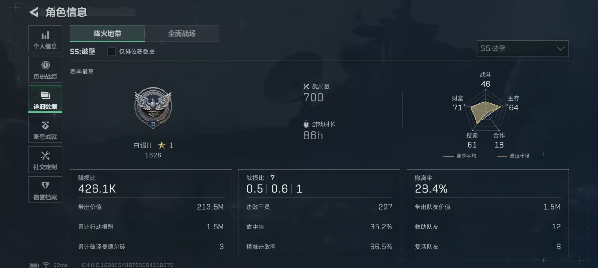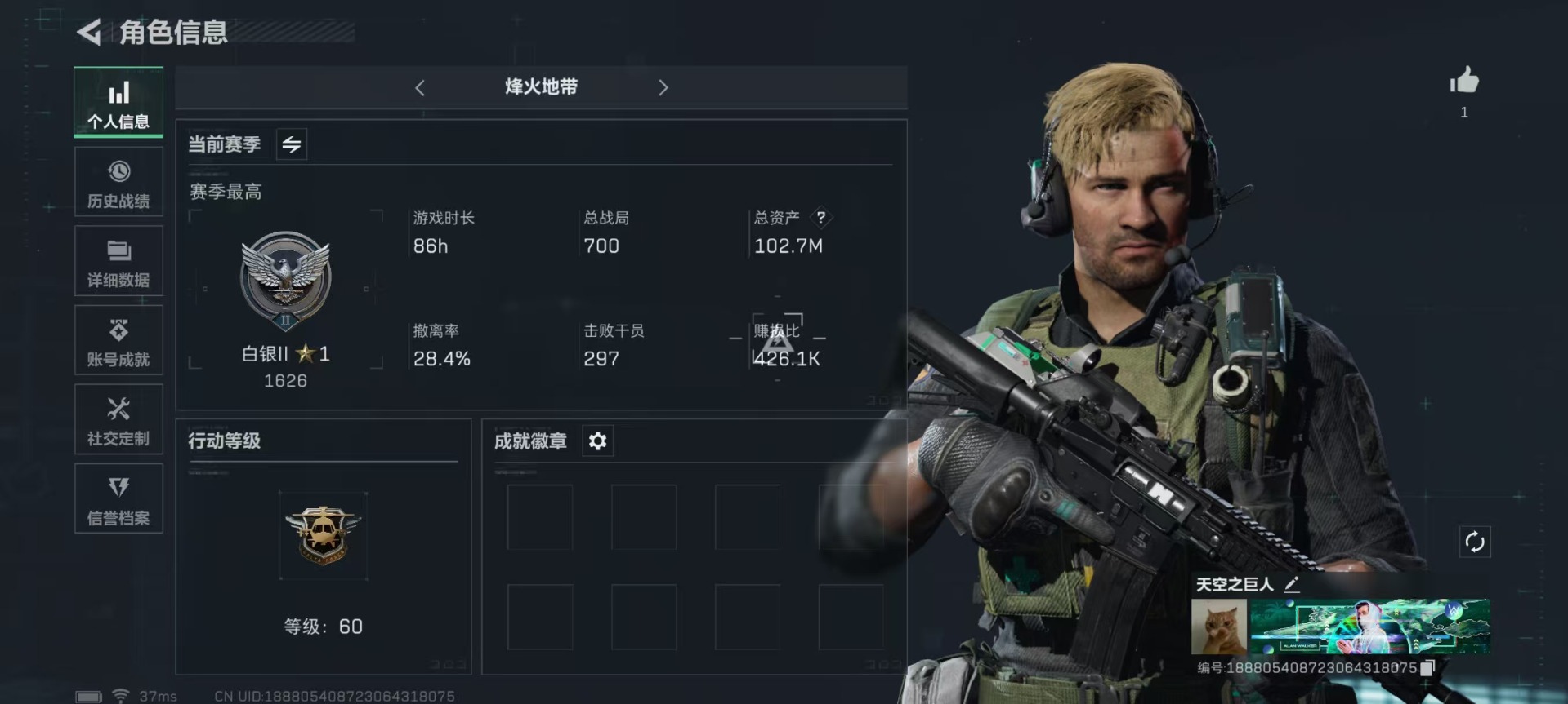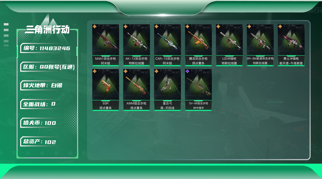 [11483246]总资产:102.7M 10传说枪械 哈夫币:100K 可二次 可修改实名 烽火地带段位:白银 全面战场段位:无段位 传说武器皮肤:UZI冲锋枪-特斯拉线圈,AWM狙击步枪-捞点薯条,腾龙突击步枪-捞点薯条,93R-捞点薯条,AK-12突击步枪-特斯拉线圈,SR-3M紧凑突击步枪-特斯拉线圈,勇士冲锋枪-能天使-午夜邮差,复合弓-黑-天际线,M4A1突击步枪-阿米娅,CAR-15突击步枪-阿米娅 史诗武器皮肤:SV-98狙击步枪-林中猎手