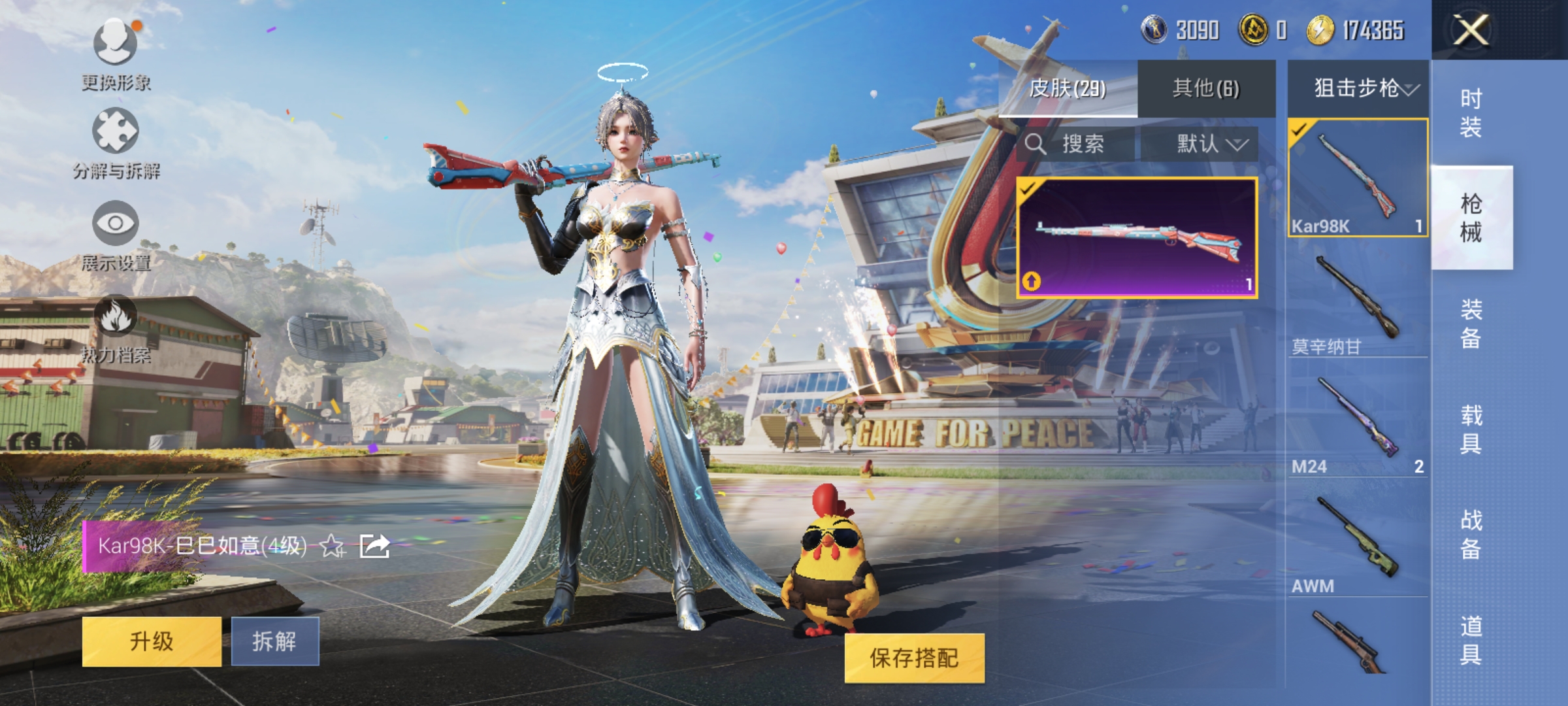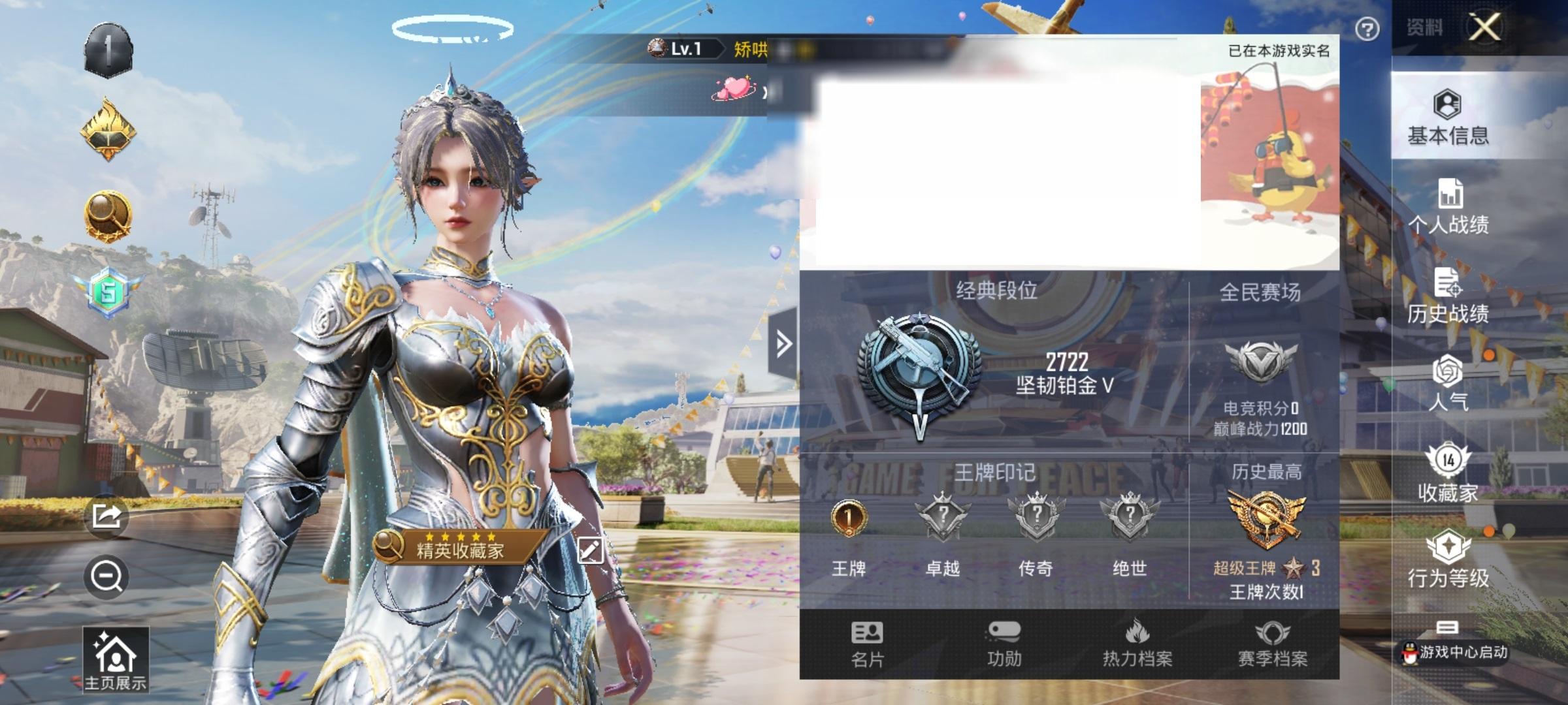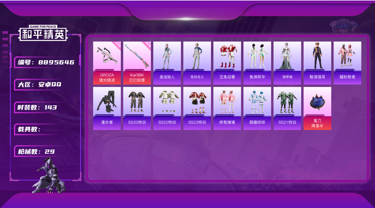 [8895646]实名: 可修改 时装数: 143 枪械数: 29 战备数: 34 稀有枪皮: GROZA-镜光银凌,Kar98K-巳巳如意 亮点: 0粉装-2特效-0载具-热力值8591-总套装143-总枪皮29-王牌印记1-历史最高超级王牌3星--GROZA-镜光银凌(5级),Kar98K-巳巳如意(4级)--套装-蓝色运动,套装-竞技名士,套装-猛禽,套装-长空猛禽,套装-漫步者,套装-冷焰舞者,套装-甜蜜告白,套装-魅力单车,套装-绮丽涂鸦,套装-耀眼新星,套装-极地朋克,套装-幻世战舞者,套装-冰川特警,套装-麻辣教官,套装-战术大师,套装-耀粉歌者,套装-飞行日记,套装-SS20特训,套装-SS21特训,套装-萌趣咩咩,套装-娇憨猪猪,套装-玉兔迎春,套装-SS22特训,套装-SS23特训,套装-星途旅人,套装-鱼渊荷华,套装-智谋强哥,角色-海琴烟-玉兔迎春背包(3级),娇憨猪猪背包(3级),蝶变背包(3级),巳巳如意背包(3级), 竞技,安卓手Q-可二次-0粉装-2特效-0载具 -