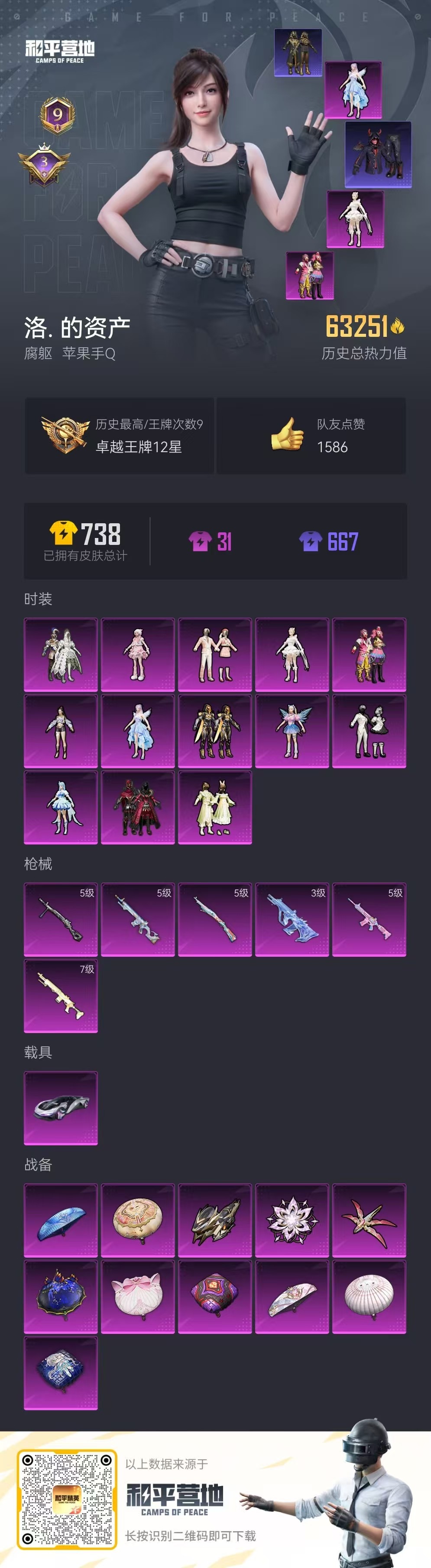 [11249666]13粉装 6特效枪 1载具 9印记 可二次 可修改实名 女号 身法装备:暗影哥特(红眼罩),沙漠守护者,8号机(新粉螳螂) 优质装备:时空跃影(星辉银),沙漠守护者(黑丝),缤纷油彩(猪妹猪脸妹),炙焰红王,冰霜白皇,MK14闲梦青缨,七级MK14-闲梦青缨,M416电玩时刻,AUG星梦奇缘,时空协奏·回响,千金淑猫,MK12-雪月幻音,羊梦糖心,Kar98K-巳巳如意 热门装扮:冰川幽秘,第五大道,闲梦青缨,美琪,电磁星,创世·救赎,星梦奇缘,沙漠守护者,兔兔白日梦,胖达圆圆,潮萌小黄鸭 五级特效枪:五级Kar98K-巳巳如意,五级DP-28-豹影疾电,五级MK12-雪月幻音,五级M416-电玩时刻 三级特效枪:三级AUG-星梦奇缘 紫色装扮:田园牧歌,轻风白浪,琉璃情波,SS22特训,星夜迷魅,和煦暖阳,SS23特训,酸甜橘柚,绚烂繁星,SS30特训套装,人气偶像,冷焰舞者,SS31特训套装,SS33特训套装,顶瓜瓜,SS15特训,SS16特训,萌趣颜团子,雪兔飞飞,粉团憨憨,SS18特训,吉莉礼服,长空猛禽,都市魅力,酒红色名流,雨林探路者,霓虹街区,青年教官,缤纷果语,耀眼新星,荣耀,蓝彩潮人,蓝色运动,街头潮人,绛羽幽主,龙的传人,飞行日记,魅力单车,黄色伏地魔,黄色名流,黄色运动,黑色伏地魔,龟仙人,冰河战士,龙魂突击队,绮丽涂鸦,极速红龙,柠萌假日,橘黑制服,涂山之恋,深蓝色名流,湖蓝色名流,夏日倾情,完美偶像,帅气教官,幻影武者,怒火燎原,恋恋初桃,战地督导,滨海假日,登山爱好者,白熊同盟,白色伏地魔,破晓战魂,破蛋小黄鸡,王牌教练,竞技达人朋克,糯粉咩咩,红色运动,猛禽,滨海厨神,灼焰舞者,猎鹰,SS29特训,白光莹,纯真浪花,热情海星,SS28特训,奶油梦幻熊,粉雾星云,极地流光,暗影刺翼,8号机(新粉螳螂),巳巳如意,光矢逐梦,异域银装,鱼渊荷华,燕燕于飞,航行童话,暗影哥特(红眼罩),绒宝小鹅,青团波波,糖糖葫芦,棉花软糖,竞技名士,都市丽猫,梦域神使,摩登魅猫,街头风暴,芝莓熊熊,黑曜寓言,湖雨初晴,智谋强哥,惊鸿侠骨,SS25特训,神气柴柴,懵萌河马,SS24特训(SS24特训套装),锦衣飞扬,明鸳圣池,星际旅行,傲娇队长,焰鹰斗篷,幻羽潜行,SS27特训,粉红小猪,浪漫天命,牛仔情诗,SS26特训,春光漫游,快闪甜心,熊抱抱