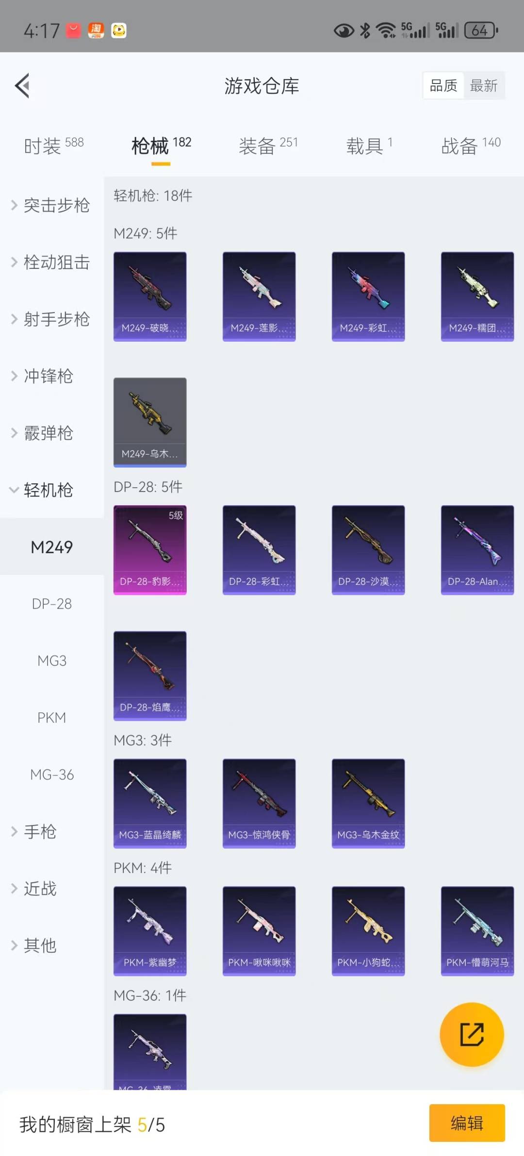 - [11836042]WBDS0076 安卓Q-87套装129枪皮 4粉装4特效枪 M416-墨龙九天 (3级) 小蓝 水仙星 烟云彩露 星穹咏叹调 Kar98K-巳巳如意 (5级) Vector-最终圣卫者 (3级) DP-28-豹影疾电 (5级) 龟仙人 粉红小猪 狂沙舞者 幻海精灵飞行器 拂晓神骑飞行器