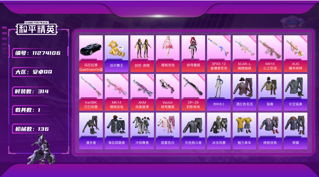 - PX_2093308- 安卓手Q-5王牌印记-2粉装-6特效枪-0载具-41808热力值-114套装-154枪皮-0卓越印记-0传奇印记 【2粉装】,冷漠罗丽,创世·救赎 【6特效枪】M416-电玩时刻-5级 M416-风花雪月-5级 Kar98K-巳巳如意-5级 Kar98K-未来歌姬-2级 UMP45-量子极限-5级 AKS-74U-星穹咏叹调-4级 【4稀有紫装】,暗影哥特,深海小丑鱼,浪