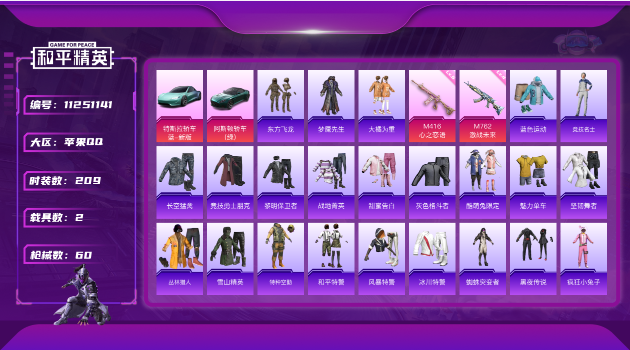 [11251141]3特效枪 2载具 可二次 可修改实名 热门装扮:大橘为重,梦魇先生,东方飞龙 载具:特斯拉Roadster(水滴蓝),阿斯顿·马丁DBS(绿) 稀有枪皮:M416心之恋语,M762激战未来 六级特效枪:六级M416-心之恋语 四级特效枪:四级M762-激战未来 紫色装扮:SS20特训,SS5特训,SS33特训套装,特种颜团子,SS15特训,静谧青瓷,银白舞王,SS13特训,SS14特训,治愈之星,迅捷之星,科技之星,SS18特训,SS19特训,冰川特警,SS16特训,瑞龙福将,团圆交子,SS17特训,蓝色运动,跃动心情,酷萌兔限定,竞技勇士朋克,长空猛禽,风暴特警,雪山精英,魅力单车,黎明保卫者,战地菁英,圣诞大吉,北国孤狼,和平特警,坚韧舞者,甜蜜告白,疯狂小兔子,牛气满满,灰色格斗者,牛气冲天,竞技名士,逆风勇士,SS6特训,SS7特训,黑夜传说,SS11特训,原初圣火,SS9特训,蜘蛛突变者,丛林猎人,特种空勤,SS12特训 优质战备:海渊国主降落伞