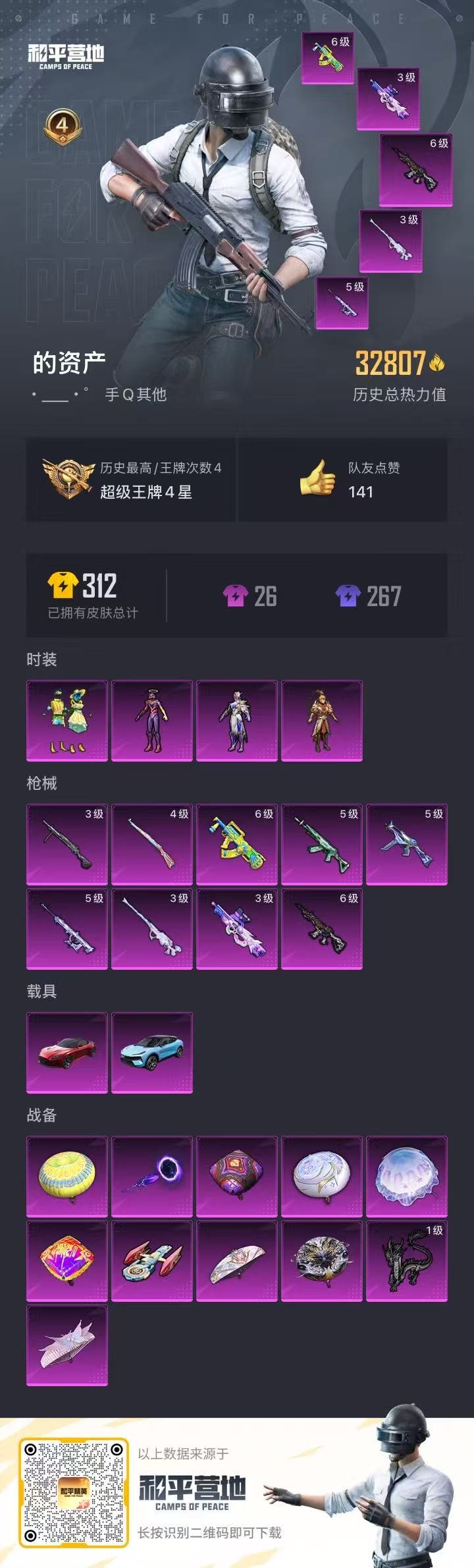 [11324541]4粉装 9特效枪 2载具 4印记 可二次 可修改实名 身法装备:初号机 觉醒Ver.(新紫螳螂),8号机(新粉螳螂),Mark.06(新蓝螳螂) 优质装备:阿斯顿·马丁DBS(红),路特斯ELETRE(冰川蓝),香水柠檬,Groza香水柠檬,P90-电糖天使,M416墨龙九天,六级M416-墨龙九天,AMR鸢尾晶梦,M200梦海之灵,UMP45量子极限,M762-青锋波束,Kar98K-巳巳如意 热门装扮:齐天大圣,星空武士,初号机 觉醒Ver.(新紫螳螂),迅捷狂鲨,呆萌铁蟹 稀有枪皮:DP-28-豹影疾电 六级特效枪:六级GROZA-香水柠檬 五级特效枪:五级M762-青锋波束,五级UMP45-量子极限,五级AMR-鸢尾晶梦 四级特效枪:四级Kar98K-巳巳如意 三级特效枪:三级P90-电糖天使,三级M200-梦海之灵,三级DP-28-豹影疾电 紫色装扮:SS31特训套装,旭日情侣,SS30特训套装,SS33特训套装,顶瓜瓜,冰爽海盐,浪漫樱花,军刀雅典娜,长空猛禽,雪山精英,蜜露汐语,魅力单车,龟仙人,冰河战士,龙魂突击队,蝶变,香桃花海,暗金炫舞,猛禽,小熊娃娃,雏菊兔兔,萝兰蝴蝶,SS29特训,极冰使者,星途旅人,纯真浪花,热情海星,曼妙人鱼,卖崽青蛙,铁血战翼,8号机(新粉螳螂),Mark.06(新蓝螳螂),冰公主,异域银装,竞技名士,粉红小猪,焰鹰斗篷,幻羽潜行,大橘大利,SS32特训服(SS32特训套装),绯格组合,光之冒险 优质战备:鸢尾晶梦降落伞,霓虹漫游降落伞,绮梦流光降落伞,墨龙九天降落伞,龙翔九天飞行器,精灵梦叶罗丽降落伞,初号机 觉醒Ver.降落伞,星途旅人降落伞,深渊漩涡飞行器,江南烟雨降落伞,香水柠檬降落伞
