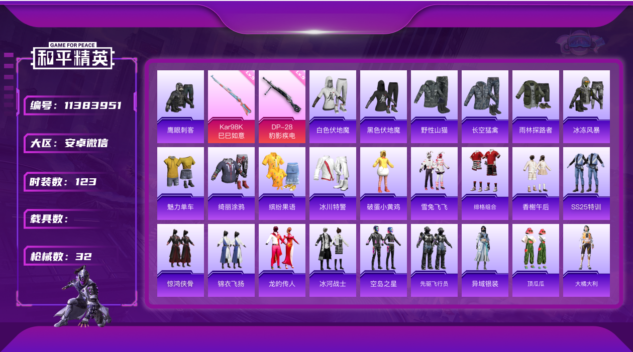 [11383951]2特效枪 可二次 可修改实名 安全保护中 优质装备:Kar98K-巳巳如意 热门装扮:鹰眼刺客 稀有枪皮:DP-28-豹影疾电 五级特效枪:五级Kar98K-巳巳如意,五级DP-28-豹影疾电 紫色装扮:香榭午后,SS31特训套装,冰川特警,SS33特训套装,顶瓜瓜,雪兔飞飞,野性山猫,长空猛禽,雨林探路者,缤纷果语,魅力单车,黑色伏地魔,龙的传人,冰河战士,绮丽涂鸦,白色伏地魔,破蛋小黄鸡,空岛之星,先驱飞行员,异域银装,惊鸿侠骨,SS25特训,锦衣飞扬,大橘大利,SS32特训服(SS32特训套装),绯格组合,冰冻风暴 优质战备:天星战神降落伞,炫光之旅降落伞