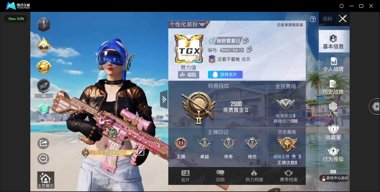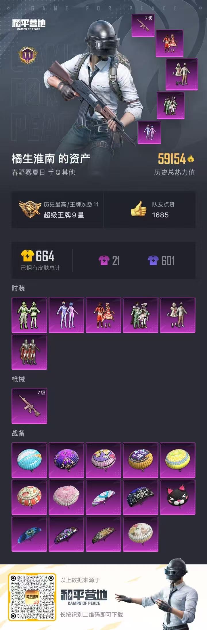 - [10598019]实名: 可修改 时装数: 182 载具数: 2 枪械数: 44 战备数: 36 热门装扮: 梦幻火箭(新101),宝贝奶油派,天使彩虹糖,甜蜜誓约,垂柳戏鸭 载具: 路特斯ELETRE(冰川蓝),玛莎拉蒂MC20(星石白) 稀有枪皮: SCAR-L梦幻火箭,M16A4垂柳戏鸭,SCAR-L-锦绣绵绵,Kar98K-巳巳如意
