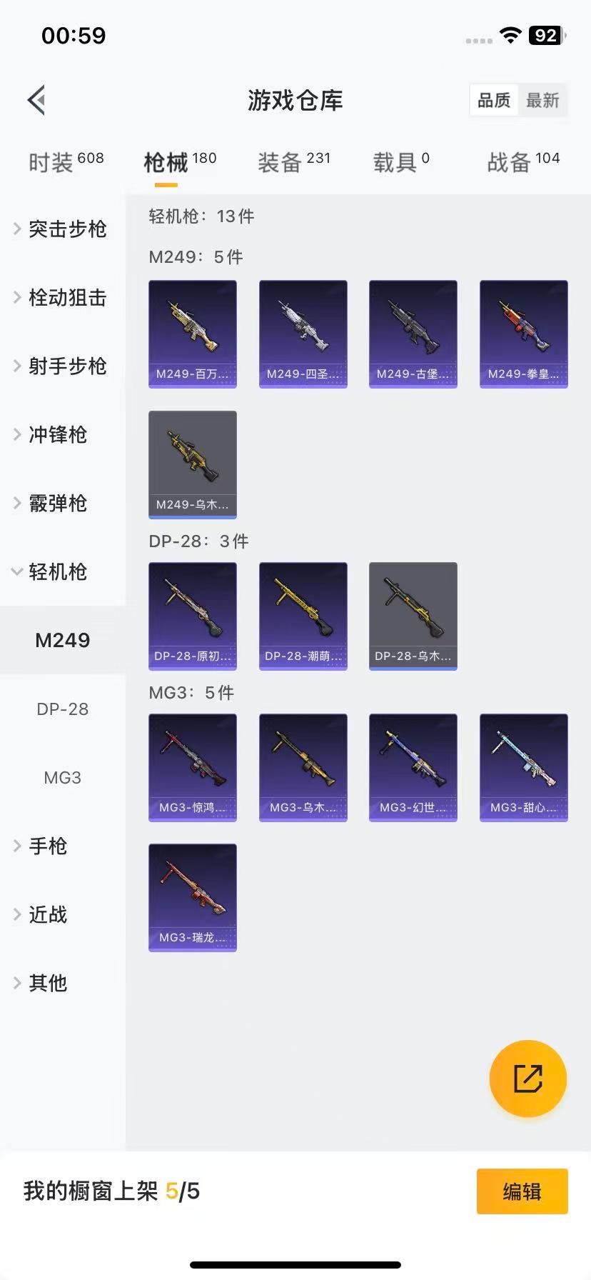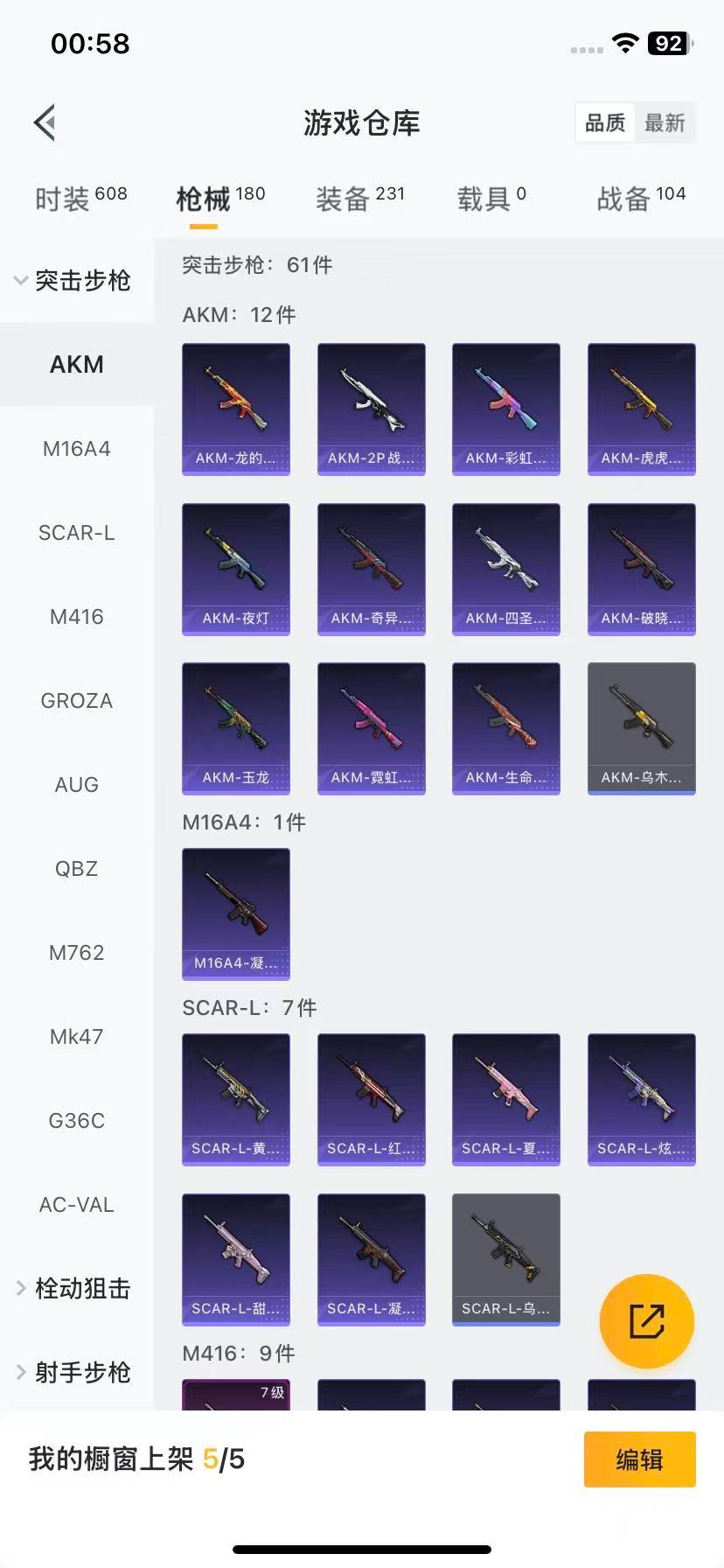 AKM-奇异狩猎者,M416-仓鼠灰灰,M762-奇异狩猎者,M762-瑞龙福将,Kar98K-深海曼妙,M24-奇异狩猎者,AWM-激战未来,S686-奇异狩猎者,M249-古堡领主