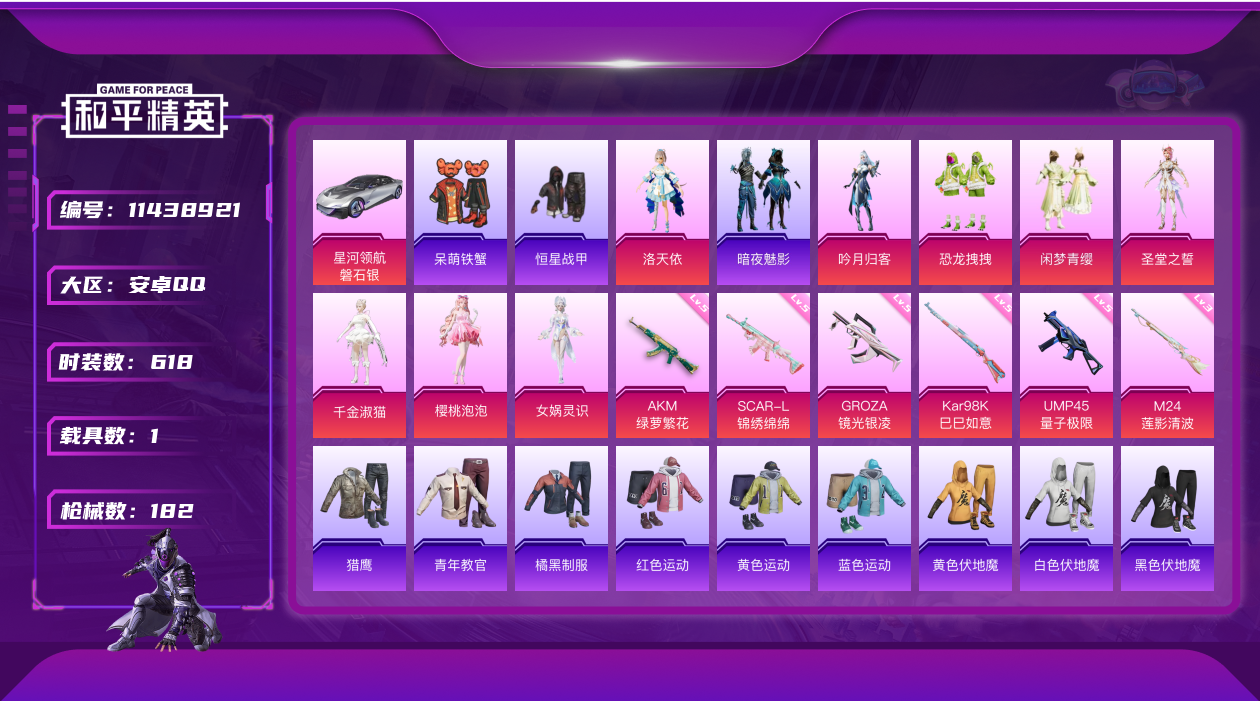[11438921]8粉装 6特效枪 1载具 6印记 可二次 可修改实名 优质装备:星河领航(磐石银),洛天依,M24莲影清波,AKM绿萝繁花,SCAR-L-锦绣绵绵,UMP45量子极限,千金淑猫,GROZA-镜光银凌,女娲灵识,樱桃泡泡,Kar98K-巳巳如意 热门装扮:吟月归客,恐龙拽拽,闲梦青缨,圣堂之誓,恒星战甲,呆萌铁蟹,暗夜魅影 五级特效枪:五级UMP45-量子极限,五级GROZA-镜光银凌,五级Kar98K-巳巳如意,五级SCAR-L-锦绣绵绵,五级AKM-绿萝繁花 三级特效枪:三级M24-莲影清波 紫色装扮:田园牧歌,轻风白浪,SS22特训,莱茵河畔,SS23特训,娇憨猪猪,萌趣咩咩,SS21特训,SS31特训套装,SS2特训,SS5特训,冰川特警,北国孤狼,千禧之恋,午夜朋克,SS30特训套装,SS33特训套装,青涩时光,潮流游乐家,SS15特训,闪银刀客,冰爽风暴,星河入梦,击剑大师,诡谋托雷基亚,治愈之星,迅捷之星,科技之星,SS14特训,萌趣颜团子,特种颜团子,SS19特训,竞技角斗士,吉莉礼服,瑞龙福将,团圆交子,SS17特训,极乐追光,SS18特训,都市漫游者,都市魅力,金鼠迎春,长空猛禽,雪山精英,霓虹街区,青年教官,青春校园,风暴特警,缤纷果语,耀眼新星,蓝彩潮人,蓝色运动,虎虎生威吉莉,跃动心情,魅力单车,鹤鸣,黄色伏地魔,黄色名流,黄色运动,黎明保卫者,黑色伏地魔,龙的传人,龟仙人,龙魂突击队,蝶变,香桃花海,和平特警,极地朋克,柠萌假日,格斗先锋,橘黑制服,沙漠兵团,派对绅士,清新柠檬,滨海假日,幻影武者,坚韧舞者,夏日音浪,夜莺强袭者,完美偶像,帅气教官,恋恋初桃,战地菁英,滨海厨神,绮丽涂鸦,甜蜜菠萝,疯狂小兔子,白色伏地魔,破晓战魂,破蛋小黄鸡,甜蜜告白,福星高照,空岛之星,竞技勇士朋克,竞技达人朋克,红色运动,甜蜜熊情侣,牛气冲天,灰色格斗者,灼焰舞者,炫蓝之夏,牛气满满,猛禽,特战装甲,特殊使命,特训学院,猎鹰,雏菊兔兔,萝兰蝴蝶,SS29特训,狂花道·娜可露露,湖畔霞光,星途旅人,SS28特训,铁血战翼,玉兔迎春,巳巳如意,都市丽猫,青团波波,糖糖葫芦,竞技名士,绒宝小鹅,街头风暴,惊鸿侠骨,SS25特训,锦衣飞扬,SS27特训,明鸳圣池,云霞荷露,晨曦薄雾,SS26特训,春光漫游,快闪甜心,贝斯之夜,SS6特训,SS7特训,黑夜传