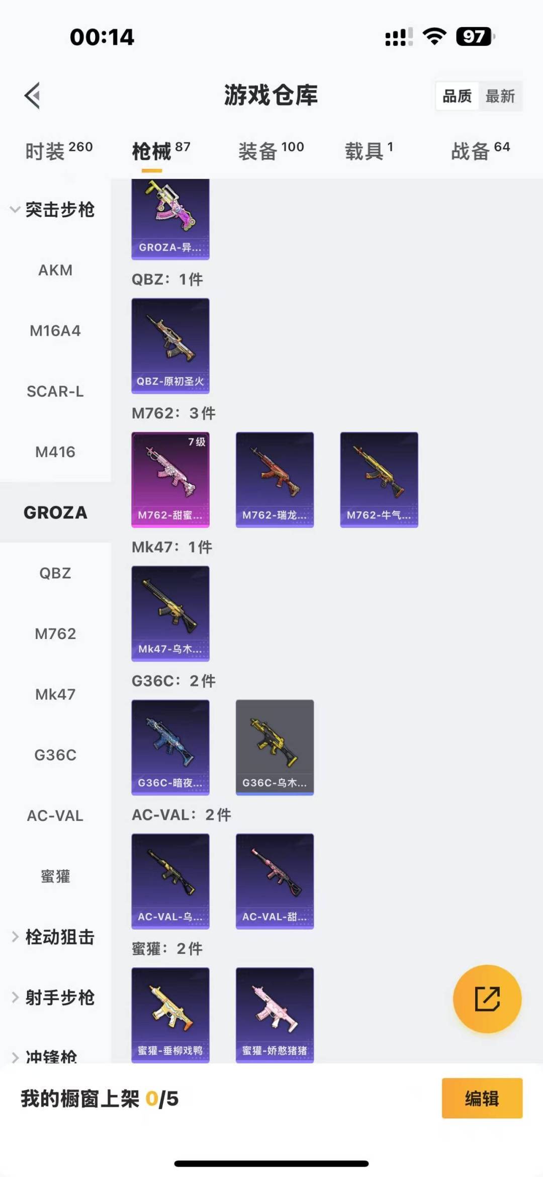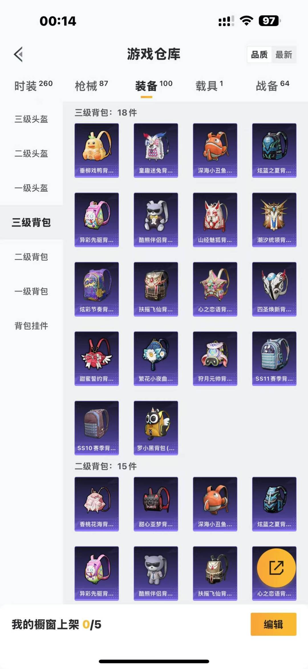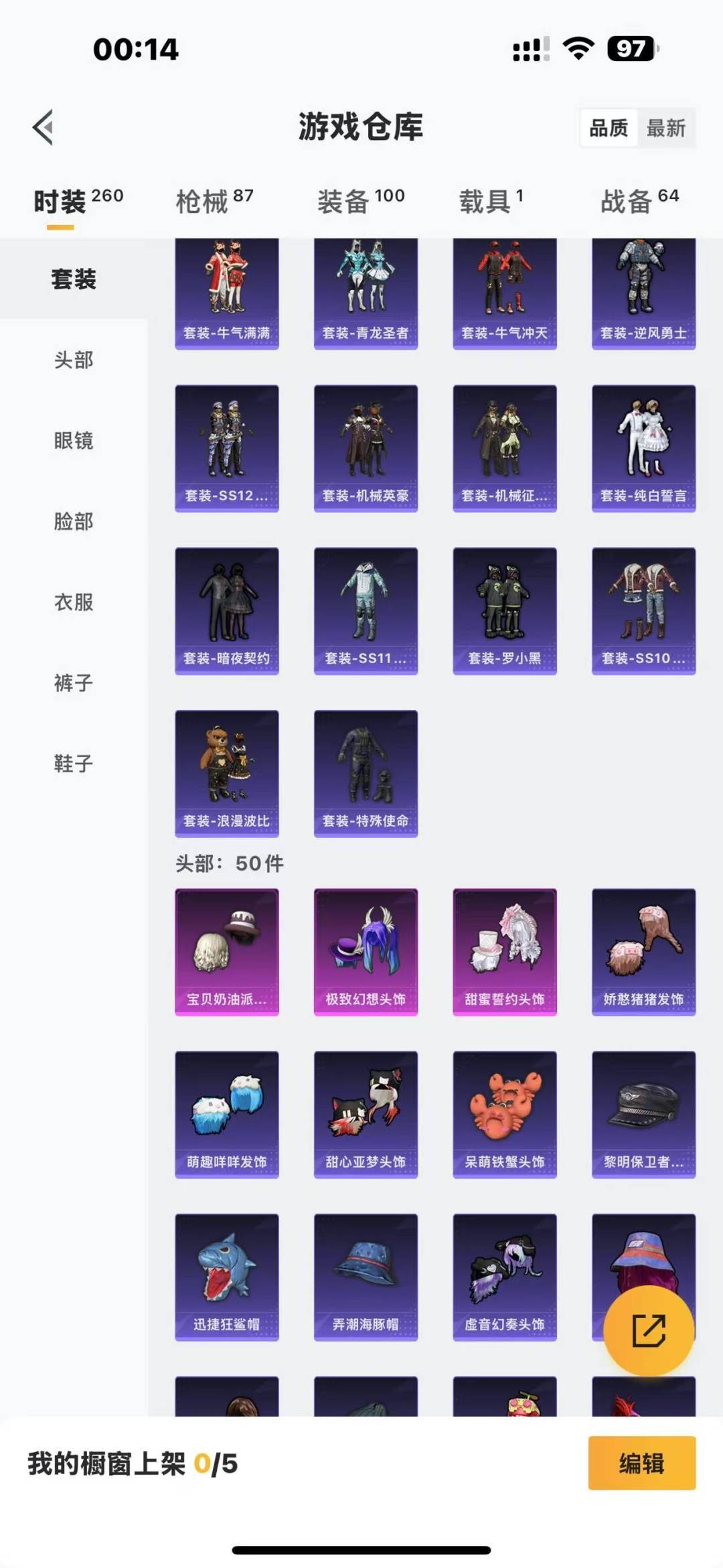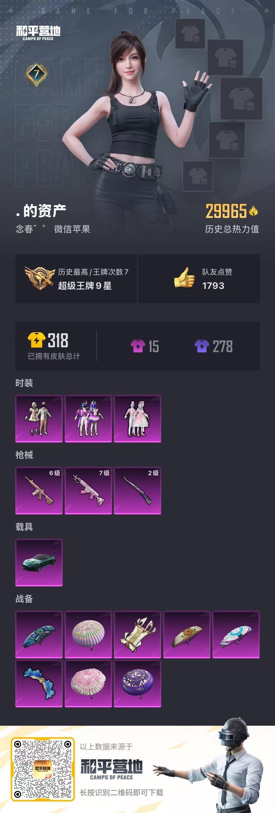 [11252757]3粉装 3特效枪 1载具 7印记 可二次 安全保护中 热门装扮:宝贝奶油派,甜蜜誓约,极致幻想,罗小黑,迅捷狂鲨,呆萌铁蟹,浪漫波比 载具:阿斯顿·马丁DBS(绿) 稀有枪皮:M416心之恋语,M762甜蜜誓约,Kar98K伏魔团 七级特效枪:七级M762-甜蜜誓约 六级特效枪:六级M416-心之恋语 二级特效枪:二级Kar98K-伏魔团 紫色装扮:萌趣咩咩,甜心亚梦,虚音幻奏,SS20特训,SS21特训,娇憨猪猪,SS30特训套装,SS13特训,SS14特训,骁骑迪迦,缤纷焰火,SS18特训,SS19特训,异彩先驱,SS16特训,瑞龙福将,团圆交子,SS17特训,极乐追光,虎虎生威吉莉,都市漫游者,都市魅力,蓝色守护者,空投萌叽,红色运动,绮丽涂鸦,耀眼新星,长空猛禽,霓虹极客,骑行爱好者,福星高照,战地菁英,幻世战舞者,甜蜜告白,特殊使命,特训学院,甜蜜熊情侣,牛气满满,灰色格斗者,炫蓝之夏,热血青春,牛气冲天,玉兔迎春,竞技名士,小丑鱼,逆风勇士,SS11特训,丝绸行者,神秘舞者,青龙圣者,原初圣火,机械征服者,机械英豪,SS10特训,纯白誓言,暗夜契约,萌黄之夏,童话森林,弄潮海豚,SS12特训 优质战备:伏魔团降落伞,繁花小夜曲飞行翼,甜蜜誓约降落伞,扶摇飞仙降落伞,飞行器-扶摇飞仙,四圣焕新降落伞,暗夜玫瑰降落伞,林间仙鹿降落伞