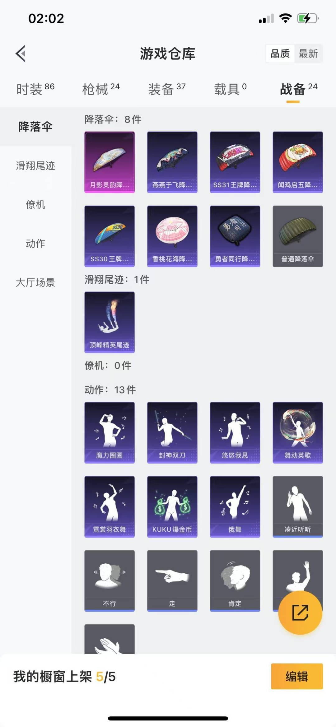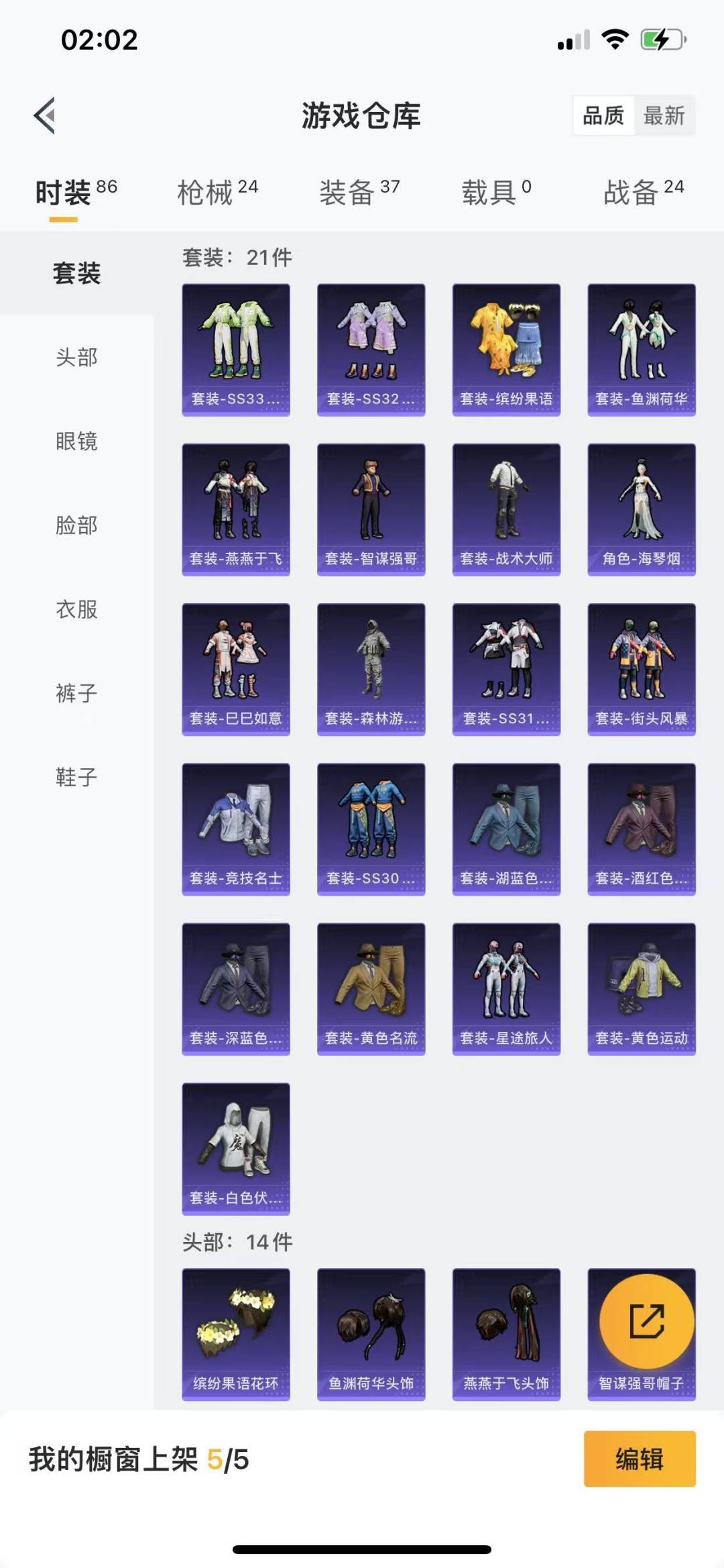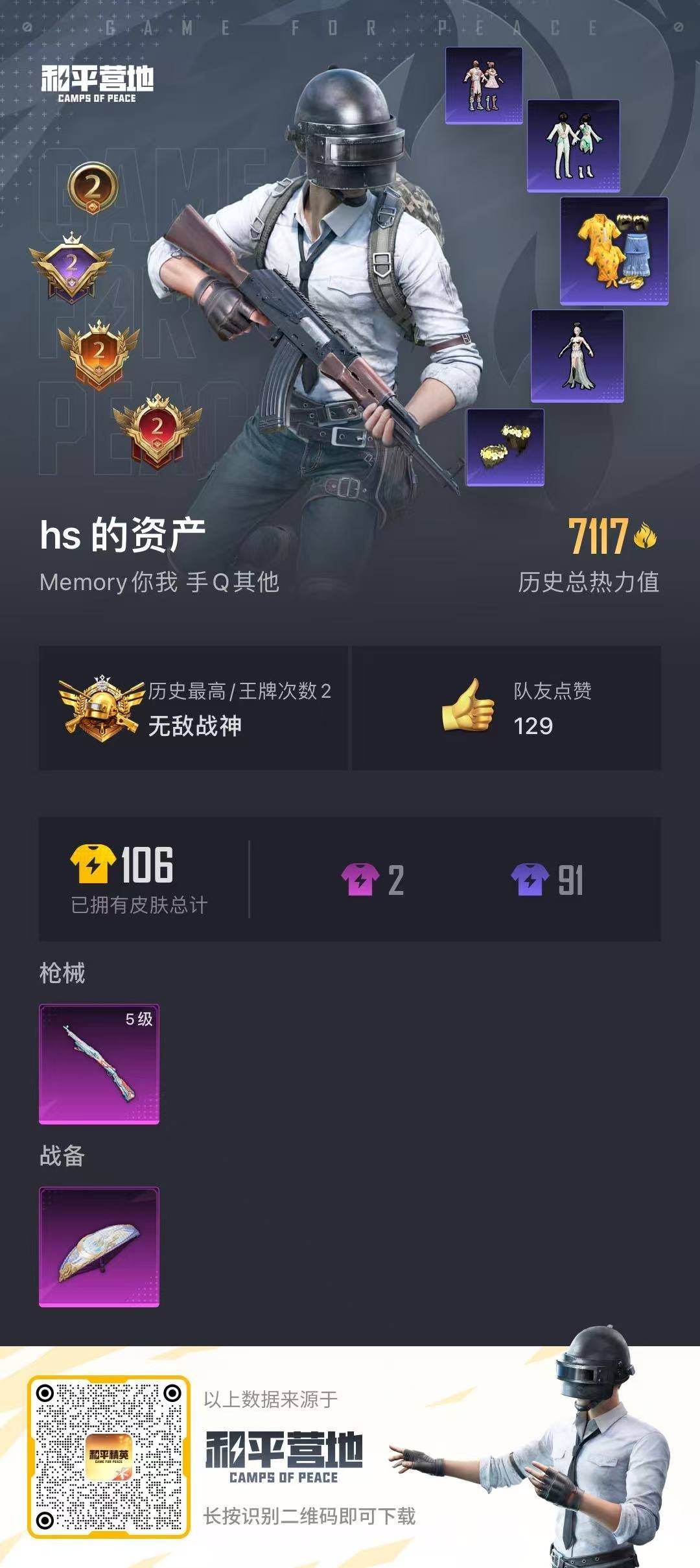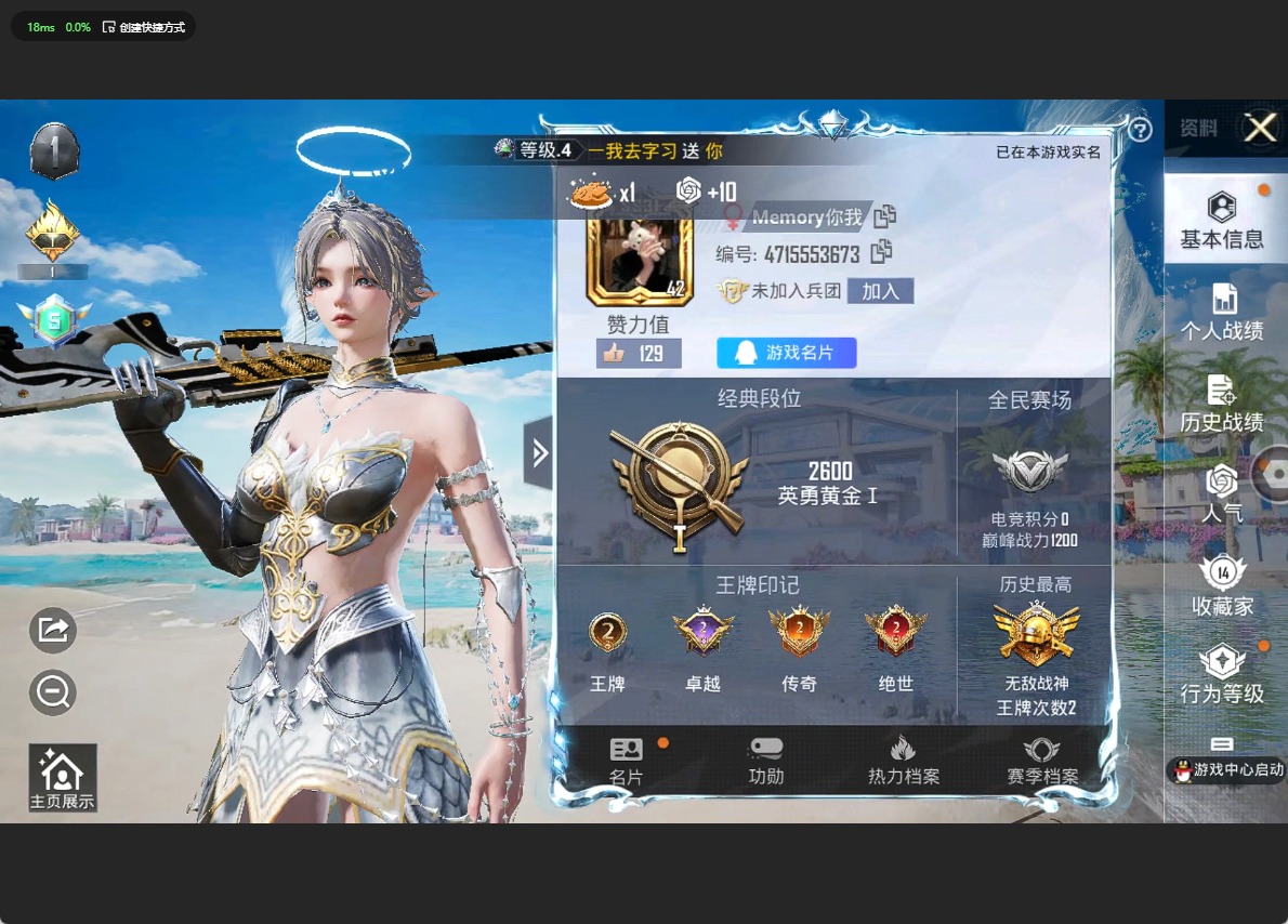 - [11972623]2粉装 5特效枪 1载具 15印记 可二次 可修改实名 身法装备:舞王派对(派对舞王、小金鞋),暗影哥特(红眼罩) 优质装备:兰博基尼Estoque(银翼灰),舞王派对(派对舞王、小金鞋),M416五爪金龙,快乐主宰,向日葵(套装-向日葵先生),七级M416-五爪金龙,GROZA-镜光银凌,萨利娅,AUG-暖羊咩咩,Kar98K-巳巳如意 时装数:858 枪械数:209 战备数:1 热门装扮:S1赛事上衣,蔷薇魔法师,万圣娃娃,梦魇先生,酷熊伴侣,深海小丑鱼,萌熊伴侣,派对舞王(小金鞋),绯红秘境 稀有枪皮:DP-28-豹影疾电 五级特效枪:五级GROZA-镜光银凌,五级Kar98K-巳巳如意,五级DP-28-豹影疾电,五级AUG-暖羊咩咩 紫色装扮:SS31特训套装,浪漫假日,SS30特训套装,SS23特训,SS33特训套装,青涩时光,幻彩翩翩,SS22特训,妙红点点,北国孤狼,午夜朋克,吉莉礼服,向日葵先生,圣诞大吉,坚韧舞者,夏日音浪,凛冬战士,夜莺强袭者,完美偶像,帅气教官,幻世保卫者,幻影武者,怒火燎原,刚毅裁决者,5.56爱好者,SS2特训,SS4特训,决胜时刻,SS5特训,云霄猎人,人气偶像,光速穿梭者,六六大吉,冰凉西瓜,冰川特警,时空追击者,暴风机械师,SS16特训,爆裂葡萄,瑞龙福将,团圆交子,SS17特训,萌趣颜团子,特种颜团子,青春冒险家,潮流游乐家,SS15特训,SS18特训,飞驰魅影,音速流光,SS19特训,战地英姿,黎明保卫者,骑行爱好者,魅力单车,黄色伏地魔,黄色名流,黄色格斗者,黄色运动,黑色伏地魔,龙的传人,龟仙人,香桃花海,青年教官,迎春赐吉,都市漫游者,酒红色名流,酷潮明星,霸义无双,金鼠迎春,长空猛禽,阳光火鸡,雪山征服者,雪山精英,雪鹰学院,霓虹极客,霓虹街区,熔岩游骑兵连帽夹克,跃动心情,超能勇士,战地菁英,深蓝色名流,清新柠檬,湖蓝色名流,滨海假日,滨海厨神,灰色格斗者,涂山之恋,炫蓝之夏,热血青春,热血骑手,熔岩使者,牛气冲天,牛气满满,特工巴纳纳,特工红苹果,特工青苹果,特战英豪,战地领军,极地朋克,柠萌假日,橘黑制服,沙漠兵团,派对绅士,特战装甲,红色运动,绮丽涂鸦,缤纷假日,缤纷果语,蓝彩潮人,蓝色守护者,蓝色运动,虎虎生威吉莉,血色贵族,紧急救援,竞技达人朋克,狂战萌兔,狂沙舞者,猎鹰,猛禽,王牌教练,甜