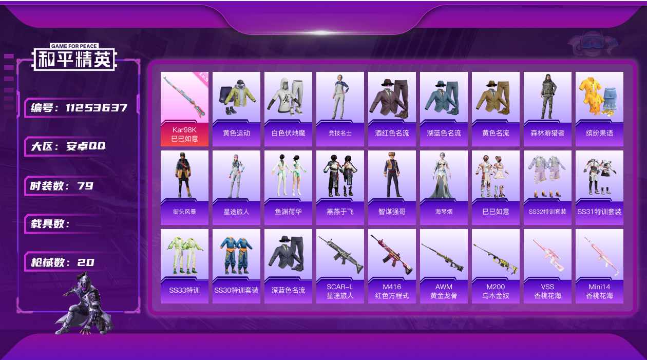 [11253637]1特效枪 2印记 可二次 可修改实名 女号 稀有枪皮:Kar98K-巳巳如意 五级特效枪:五级Kar98K-巳巳如意 紫色装扮:SS30特训套装,SS31特训套装,SS33特训套装,酒红色名流,缤纷果语,黄色名流,黄色运动,白色伏地魔,深蓝色名流,湖蓝色名流,燕燕于飞,鱼渊荷华,巳巳如意,森林游猎者,海琴烟,星途旅人,竞技名士,街头风暴,SS32特训服(SS32特训套装),智谋强哥 优质战备:月影灵韵降落伞