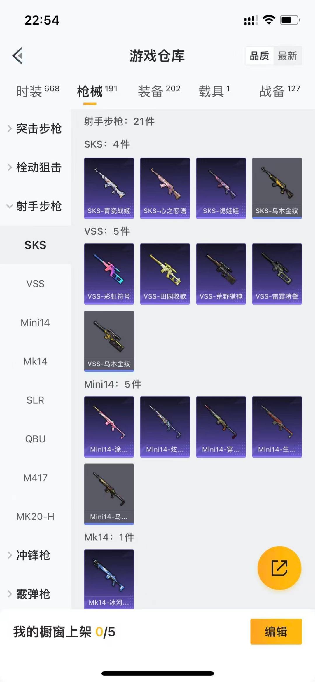 - [12234713]1粉装 7特效枪 10印记 可二次 可修改实名 优质装备:AMR炫光之旅,AKM绿萝繁花,SCAR-L-锦绣绵绵,七级AMR-炫光之旅,GROZA-镜光银凌,AUG-暖羊咩咩,雪月幻音,Kar98K-巳巳如意 热门装扮:呆萌铁蟹 稀有枪皮:DP-28-豹影疾电 五级特效枪:五级GROZA-镜光银凌,五级Kar98K-巳巳如意,五级DP-28-豹影疾电,五级AUG-暖羊咩咩,五级SCAR-L-锦绣绵绵,五级AKM-绿萝繁花 紫色装扮:田园牧歌,轻风白浪,SS22特训,飞狐塔尔斯,SS23特训,幻彩翩翩,妙红点点,娇憨猪猪,萌趣咩咩,SS21特训,熠彩粉晶,SS31特训套装,人气偶像,军械专家,冰川特警,SS30特训套装,云朵鹅,雪绒豹,SS33特训套装,青涩时光,顶瓜瓜,SS20特训,酒红色名流,长空猛禽,雪山精英,雪鹰学院,霓虹街区,青年教官,缤纷果语,耀眼新星,荣耀,蓝彩潮人,蓝色守护者,蓝色运动,虎虎生威吉莉,飞行日记,龙腾端午,骑行爱好者,魅力单车,鹤鸣,麻辣教官,黄色伏地魔,黄色名流,黄色运动,黑色伏地魔,龙的传人,龟仙人,冰河战士,龙魂突击队,蝶变,柠萌假日,橘黑制服,海岛探路者,涂山之恋,深蓝色名流,清新柠檬,夏日倾情,完美偶像,帅气教官,幻世战舞者,湖蓝色名流,绮丽涂鸦,甜蜜菠萝,白色伏地魔,破蛋小黄鸡,空岛之星,空投萌叽,竞技达人朋克,红色运动,王牌教练,牛气冲天,猛禽,特战英豪,猎鹰,SS29特训,星途旅人,SS28特训,鱼渊荷华,玉兔迎春,燕燕于飞,巳巳如意,森林游猎者,竞技名士,许七安,怀庆长公主,惊鸿侠骨,SS24特训(SS24特训套装),SS25特训,锦衣飞扬,SS27特训,Alan Walker,浪漫天命,SS26特训,智谋强哥,精神漫游,大橘大利,春日漫步,SS32特训服(SS32特训套装),猎影月神,绯格组合,萌黄之夏,白糯汤圆,冰冻风暴,光之冒险,青羽突袭者 优质战备:星途旅人降落伞,临安公主降落伞,炫光之旅降落伞,纯梦嫁纱降落伞