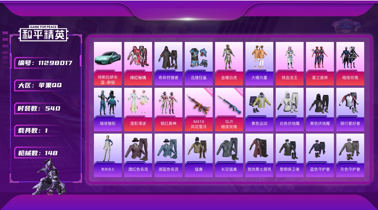 - PX_2095058- 苹果微信-25王牌印记-1粉装-2特效枪-1载具-40038热力值-129套装-108枪皮-0卓越印记-0传奇印记 【1粉装】,水曜玄武 【2特效枪】SCAR-L-梦幻火箭-7级 Kar98K-巳巳如意-3级 【2稀有紫装】,雪山精英,暗夜魅影, 【1稀有载具】,玛莎拉蒂Ghibli(粉), 【129稀有时装】,SS31特训,SS32特训,暗夜魅影,雪山精英, 暗影刺翼,