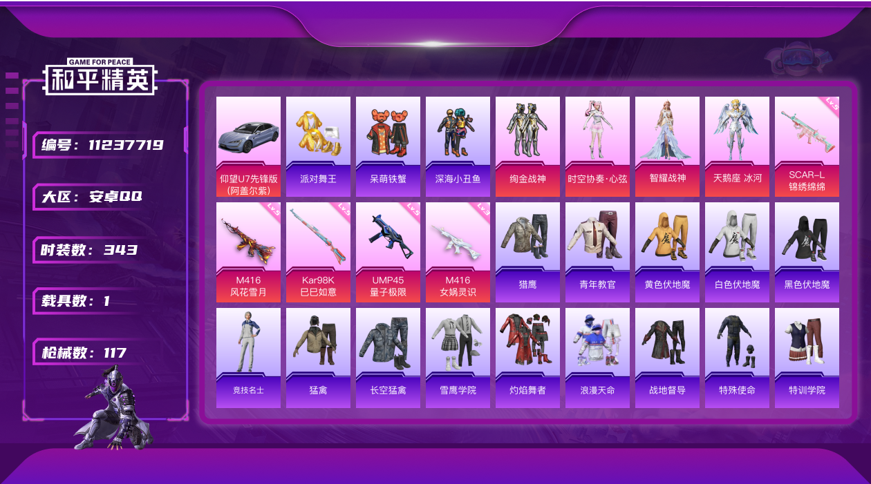 [11237719]4粉装 5特效枪 1载具 7印记 可二次 可修改实名 身法装备:舞王派对(派对舞王、小金鞋),暗影哥特(红眼罩),Mark.06(新蓝螳螂) 优质装备:仰望U7先锋版(阿盖尔紫),舞王派对(派对舞王、小金鞋),绚金战神,M416风花雪月,SCAR-L-锦绣绵绵,UMP45量子极限,时空协奏·心弦,M416-女娲灵识,智耀战神,天鹅座 冰河,Kar98K-巳巳如意 热门装扮:呆萌铁蟹,深海小丑鱼,派对舞王(小金鞋) 五级特效枪:五级UMP45-量子极限,五级Kar98K-巳巳如意,五级SCAR-L-锦绣绵绵,五级M416-风花雪月 三级特效枪:三级M416-女娲灵识 紫色装扮:SS22特训,SS23特训,SS21特训,SS31特训套装,云朵鹅,雪绒豹,SS33特训套装,SS20特训,音速流光,瑞龙福将,团圆交子,SS17特训,异彩先驱,SS18特训,都市魅力,长空猛禽,雪鹰学院,雷霆特警,霓虹极客,青年教官,青春校园,缤纷果语,街头潮人,青涩年华,蓝海鲸歌,魅力单车,鹤鸣,黄色伏地魔,黑色伏地魔,龙的传人,蝶变,极地朋克,柠萌假日,格斗先锋,暗金炫舞,深蓝色名流,清新柠檬,幻影武者,夏日倾情,战地督导,绮丽涂鸦,白色伏地魔,破蛋小黄鸡,空投萌叽,王牌教练,灼焰舞者,猛禽,特殊使命,特训学院,猎鹰,小熊娃娃,雏菊兔兔,萝兰蝴蝶,SS29特训,湖畔霞光,星途旅人,创世·幻影,白光莹,纯真浪花,热情海星,SS28特训,Mark.06(新蓝螳螂),光矢逐梦,鱼渊荷华,燕燕于飞,巳巳如意,竞技名士,暗影哥特(红眼罩),惊鸿侠骨,SS25特训,锦衣飞扬,粉红小猪,SS27特训,浪漫天命,SS26特训,春光漫游,快闪甜心,智谋强哥,大橘大利,耀粉歌者,粉恋花,蓝冰羽,紫幽梦,SS32特训服(SS32特训套装),猎影月神,恋语绒绒,冰冻风暴,光之冒险 优质战备:创世·救赎降落伞,星空武士降落伞,千金淑猫降落伞,荧海星豚降落伞,鬼刀降落伞,智耀战神降落伞,彩虹独角兽降落伞,千面幻镜降落伞,炫光之旅降落伞,齐天大圣降落伞