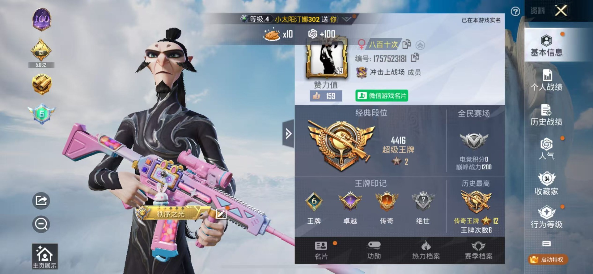 [11353779]3特效枪 6印记 可二次 可修改实名 永久社交场景限制 身法装备:Mark.06(新蓝螳螂) 优质装备:M416电玩时刻,Kar98K-巳巳如意 稀有枪皮:DP-28-豹影疾电 五级特效枪:五级Kar98K-巳巳如意,五级DP-28-豹影疾电,五级M416-电玩时刻 紫色装扮:SS31特训套装,SS30特训套装,SS33特训套装,缤纷果语,黑色伏地魔,龙的传人,龟仙人,冰河战士,龙魂突击队,蝶变,雏菊兔兔,萝兰蝴蝶,SS29特训,创世·幻影,纯真浪花,热情海星,曼妙人鱼,SS28特训,创世·追猎,Mark.06(新蓝螳螂),海琴烟,惊鸿侠骨,SS25特训,锦衣飞扬,SS26特训,耀粉歌者,SS32特训服(SS32特训套装),绯格组合,蓝调潮人,街舞之王 优质战备:英伦信使飞行器,飞行翼-星夜魔法师