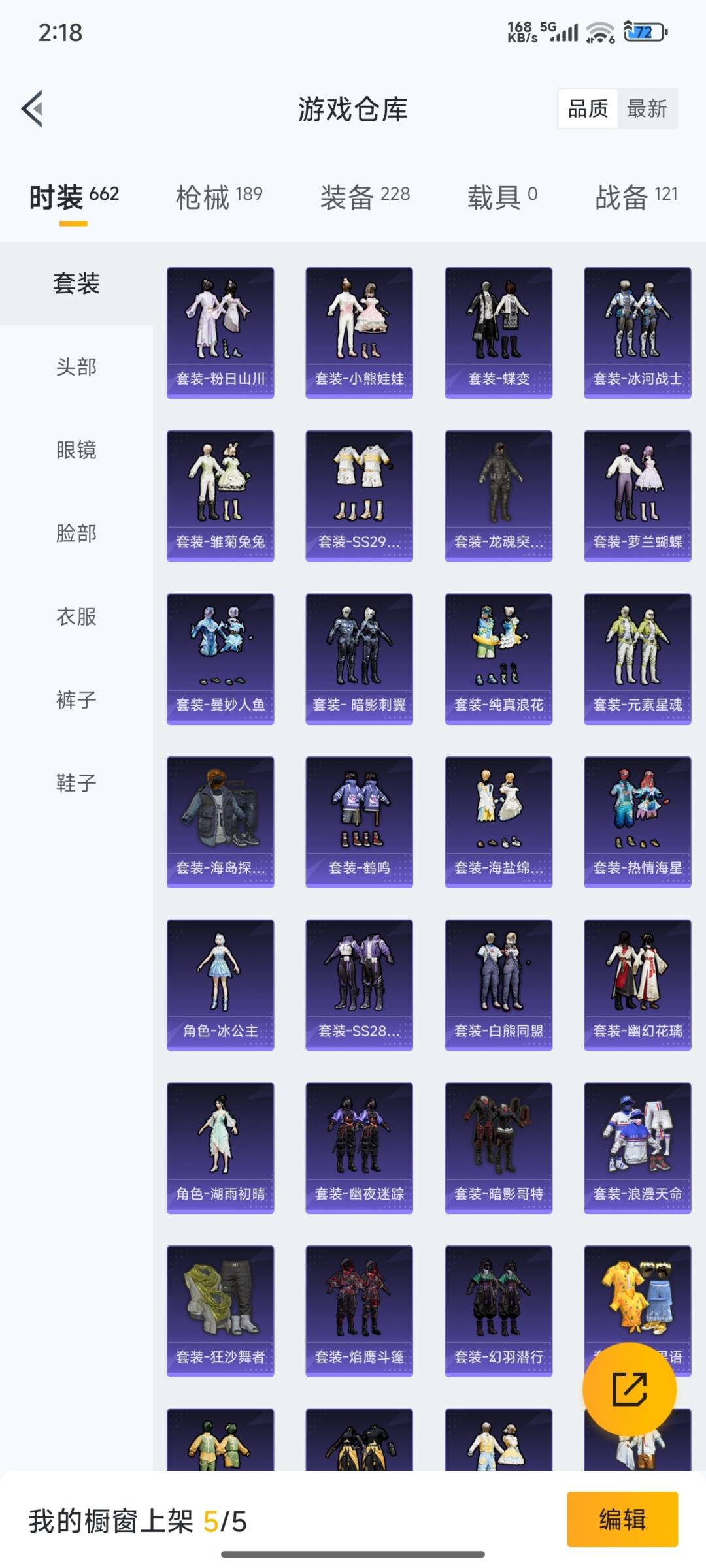 - [12168606]2粉装 5特效枪 2印记 可二次 可修改实名 优质装备:M249猪猪侠,SCAR-L-锦绣绵绵,M416电玩时刻,Kar98K-巳巳如意 热门装扮:第五大道,猪猪侠,爱崽白熊,深海小丑鱼 稀有枪皮:DP-28-豹影疾电 五级特效枪:五级Kar98K-巳巳如意,五级DP-28-豹影疾电,五级M416-电玩时刻,五级M249-猪猪侠,五级SCAR-L-锦绣绵绵 紫色装扮:SS31特训套装,SS30特训套装,霓虹街区,缤纷果语,鹤鸣,龟仙人,海岛探路者,破蛋小黄鸡,星途旅人,纯真浪花,热情海星,SS28特训,卖崽青蛙,创世·追猎,冰公主,巳巳如意,竞技名士,情公主,粉红小猪,湖雨初晴,菲菲,超人强,焰鹰斗篷,幻羽潜行,幽夜迷踪,SS27特训,霓彩缤纷,浪漫天命,春光漫游,快闪甜心,SS32特训服(SS32特训套装),白糯汤圆,漫步者 优质战备:创世·救赎降落伞,幻海精灵飞行器,精灵梦叶罗丽降落伞,星空武士降落伞,江南烟雨降落伞,橘柚倾心降落伞,祥瑞锦鲤飞行器,猪猪侠降落伞,喜羊羊与灰太狼降落伞,第五大道降落伞