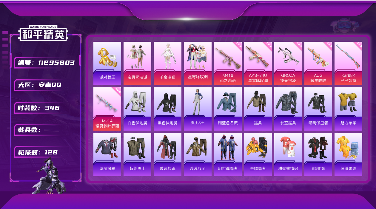 [11295803]3粉装 6特效枪 16印记 可二次 身法装备:舞王派对(派对舞王、小金鞋) 优质装备:舞王派对(派对舞王、小金鞋),M416心之恋语,宝贝奶油派,七级M416-心之恋语,Mk14精灵梦叶罗丽,千金淑猫,GROZA-镜光银凌,AUG-暖羊咩咩,星穹咏叹调,AKS-74U-星穹咏叹调,七级AKS-74U-星穹咏叹调,Kar98K-巳巳如意 热门装扮:派对舞王(小金鞋) 五级特效枪:五级GROZA-镜光银凌,五级Mk14-精灵梦叶罗丽,五级Kar98K-巳巳如意,五级AUG-暖羊咩咩 紫色装扮:SS22特训,SS23特训,梦幻奶油,娇憨猪猪,萌趣咩咩,暖心熊熊,SS21特训,SS30特训套装,青涩时光,SS20特训,SS31特训套装,云朵鹅,彩虹兔,雪绒豹,SS33特训套装,顶瓜瓜,时希公主,乐音,SS15特训,SS16特训,萌趣颜团子,特种颜团子,SS19特训,SS17特训,SS18特训,长空猛禽,缤纷果语,虎虎生威吉莉,超能勇士,无面战甲,龙的传人,魅力单车,麻辣教官,黎明保卫者,黑色伏地魔,龟仙人,香桃花海,绮丽涂鸦,沙漠兵团,湖蓝色名流,幻世战舞者,夏日音浪,甜蜜熊情侣,白色伏地魔,破晓战魂,福星高照,空岛之星,猛禽,炫蓝之夏,牛气冲天,牛气满满,SS29特训,狂花道·娜可露露,银尘,白光莹,星途旅人,情公主,巳巳如意,异域银装,鱼渊荷华,玉兔迎春,燕燕于飞,青团波波,糖糖葫芦,棉花软糖,竞技名士,街头风暴,冰公主,智谋强哥,惊鸿侠骨,SS25特训,神气柴柴,懵萌河马,SS24特训(SS24特训套装),锦衣飞扬,绝对偶像,金戈铁马,粉红小猪,SS26特训,大橘大利,星渊小夜曲,星影赞美诗,粉恋花,蓝冰羽,紫幽梦,SS32特训服(SS32特训套装),绯格组合,白糯汤圆,恋语绒绒,金耀舞者,光之冒险 优质战备:精灵梦叶罗丽降落伞,星途旅人降落伞,闲梦青缨降落伞,垂柳戏鸭降落伞,甜心宝贝降落伞,流星咚咚降落伞