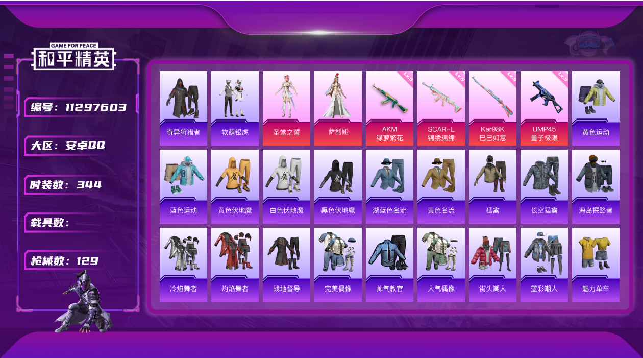 [11297603]2粉装 4特效枪 10印记 可二次 可修改实名 优质装备:奇异狩猎者,AKM绿萝繁花,SCAR-L-锦绣绵绵,UMP45量子极限,萨利娅,Kar98K-巳巳如意 热门装扮:圣堂之誓,软萌银虎 五级特效枪:五级UMP45-量子极限,五级Kar98K-巳巳如意,五级SCAR-L-锦绣绵绵,五级AKM-绿萝繁花 紫色装扮:田园牧歌,轻风白浪,SS22特训,SS23特训,娇憨猪猪,梦幻奶油,萌趣咩咩,SS21特训,SS31特训套装,人气偶像,冰川特警,冷焰舞者,极速光影,SS30特训套装,SS33特训套装,青涩时光,顶瓜瓜,SS20特训,都市漫游者,都市魅力,长空猛禽,霓虹街区,缤纷果语,耀眼新星,荣耀,荧惑魅影,蓝彩潮人,蓝色运动,街头潮人,魅力单车,麻辣教官,黄色伏地魔,黄色名流,黄色运动,黑色伏地魔,龙的传人,冰河战士,龙魂突击队,蝶变,海岛探路者,涂山之恋,完美偶像,帅气教官,幻世战舞者,战地督导,探宝勇士,湖蓝色名流,绮丽涂鸦,白色伏地魔,破晓战魂,破蛋小黄鸡,空岛之星,竞技达人朋克,王牌教练,灼焰舞者,猛禽,SS29特训,米开朗基罗,星途旅人,白光莹,纯真浪花,热情海星,SS28特训,鱼渊荷华,燕燕于飞,巳巳如意,惊鸿侠骨,神气柴柴,懵萌河马,SS24特训(SS24特训套装),萤火魅影(套装-荧惑魅影),SS25特训,元气发射,锦衣飞扬,焰鹰斗篷,幻羽潜行,SS27特训,明鸳圣池,金羽特工,SS26特训,春光漫游,快闪甜心,大橘大利,智慧之神,SS32特训服(SS32特训套装),绯格组合,糖霜甜心,金耀舞者,蓝调潮人,光之冒险 优质战备:圣堂之誓降落伞,创世·救赎降落伞,精灵梦叶罗丽降落伞,星途旅人降落伞,江南烟雨降落伞,星之彼岸降落伞,幻彩电音降落伞,幻星舰长飞行器,彩虹甜喵降落伞,幻影战神降落伞