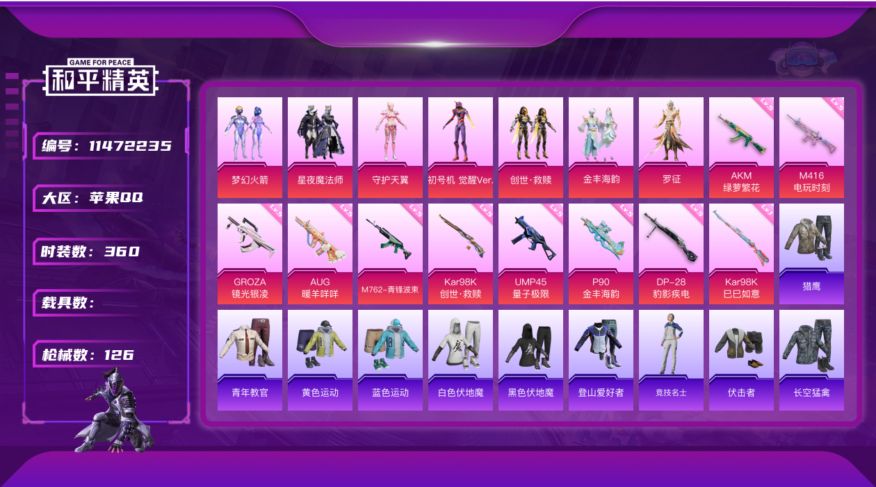 [11472235]7粉装 10特效枪 2印记 可二次 可修改实名 身法装备:初号机 觉醒Ver.(新紫螳螂),8号机(新粉螳螂),Mark.06(新蓝螳螂) 优质装备:梦幻火箭(新101)(新火箭少女101粉色套装),AKM绿萝繁花,M416电玩时刻,Kar98K创世·救赎,UMP45量子极限,P90-金丰海韵,M762-青锋波束,GROZA-镜光银凌,AUG-暖羊咩咩,罗征,Kar98K-巳巳如意 热门装扮:星夜魔法师,创世·救赎,守护天翼,初号机 觉醒Ver.(新紫螳螂),金丰海韵 稀有枪皮:DP-28-豹影疾电 五级特效枪:五级M762-青锋波束,五级P90-金丰海韵,五级UMP45-量子极限,五级GROZA-镜光银凌,五级Kar98K-创世·救赎,五级DP-28-豹影疾电,五级AUG-暖羊咩咩,五级M416-电玩时刻,五级AKM-绿萝繁花 一级特效枪:一级Kar98K-巳巳如意 紫色装扮:SS23特训,SS31特训套装,SS5特训,伏击者,冰原使者,,冷焰舞者,凛冬战士,北国孤狼,旭日情侣,SS30特训套装,云朵鹅,彩虹兔,雪绒豹,SS33特训套装,都市漫游者,酷潮明星,金鼠迎春,长空猛禽,雪山征服者,雪山精英,霓虹街区,青年教官,缤纷果语,蓝色运动,跃动心情,魅力单车,黄色运动,黑色伏地魔,龙的传人,龟仙人,蝶变,柠萌假日,圣诞大吉,战地菁英,绮丽涂鸦,疯狂小兔子,登山爱好者,白色伏地魔,甜蜜告白,空岛之星,竞技勇士朋克,牛气冲天,灰色格斗者,热血青春,猎鹰,粉日山川,雏菊兔兔,萝兰蝴蝶,SS29特训,湖畔霞光,创世·幻影,纯真浪花,热情海星,SS28特训,创世·追猎,8号机(新粉螳螂),Mark.06(新蓝螳螂),鱼渊荷华,燕燕于飞,巳巳如意,风玲,竞技名士,情公主,SS24特训(SS24特训套装),SS25特训,焰鹰斗篷,幻羽潜行,SS27特训,明鸳圣池,小丑鱼,SS26特训,春光漫游,快闪甜心,精神漫游,炽焰拳师,格斗专家,SS6特训,核芯基因,SS7特训,拳皇97草薙京,SS32特训服(SS32特训套装),绯格组合,丛林猎人,传奇侦探 优质战备:创世·救赎降落伞,精灵梦叶罗丽降落伞,初号机 觉醒Ver.降落伞,初号机 觉醒Ver.飞行器,金丰海韵降落伞,千面幻镜降落伞,太空嘟嘟降落伞,梦幻火箭降落伞,梦幻火箭飞行器,飞行器-齐天大圣