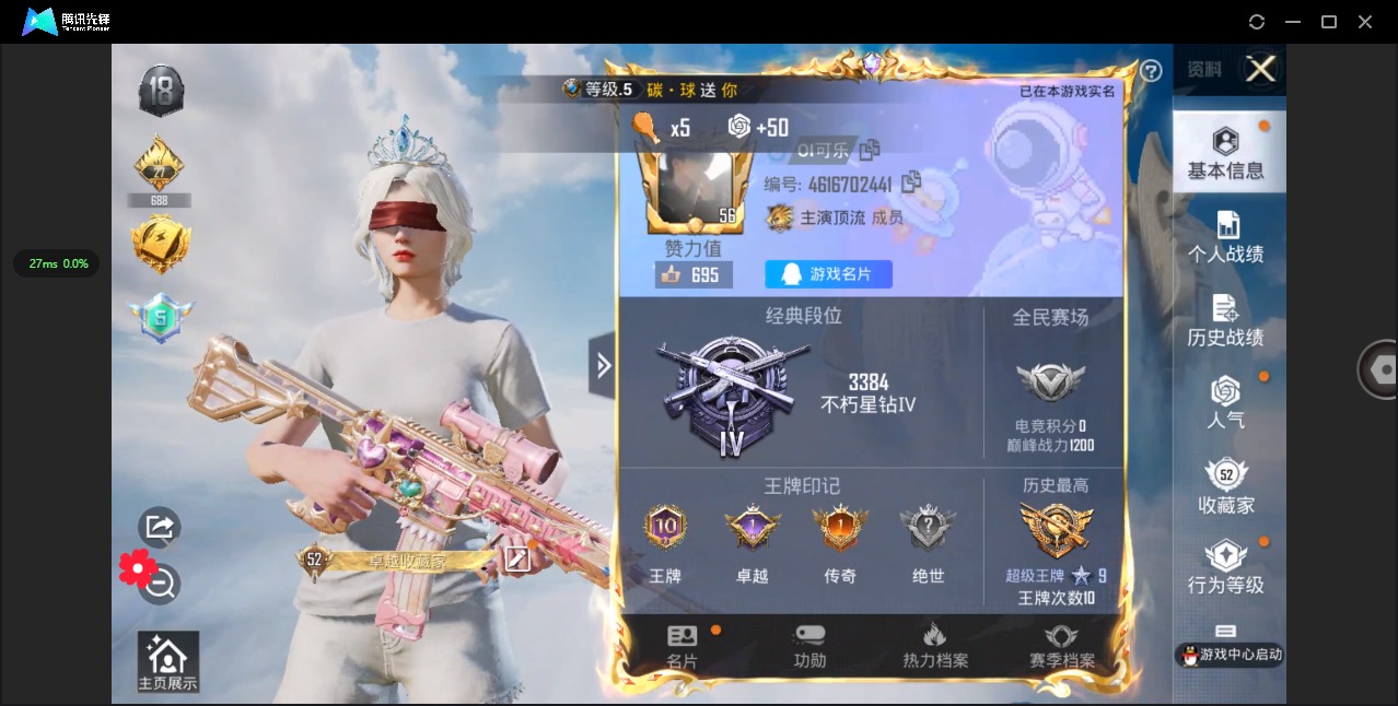 - PX_2071598-苹果QQ 历史总热力值:94691 粉装数量:12 特效枪数量:7 载具数量:3 王牌印记:15 历史最高段位:超级王牌14星 套装数量:215 时装数量:781 枪械数量:259 战备数量:190 装备数量:369 载具:特斯拉Roadster(沁心粉),阿斯顿·马丁DBS(红),鬼马风驰 时装:套装-幻彩马卡龙,套装-暗夜玫瑰,套装-第五大道,套装-蜜桃特工,套装-蜜语绒