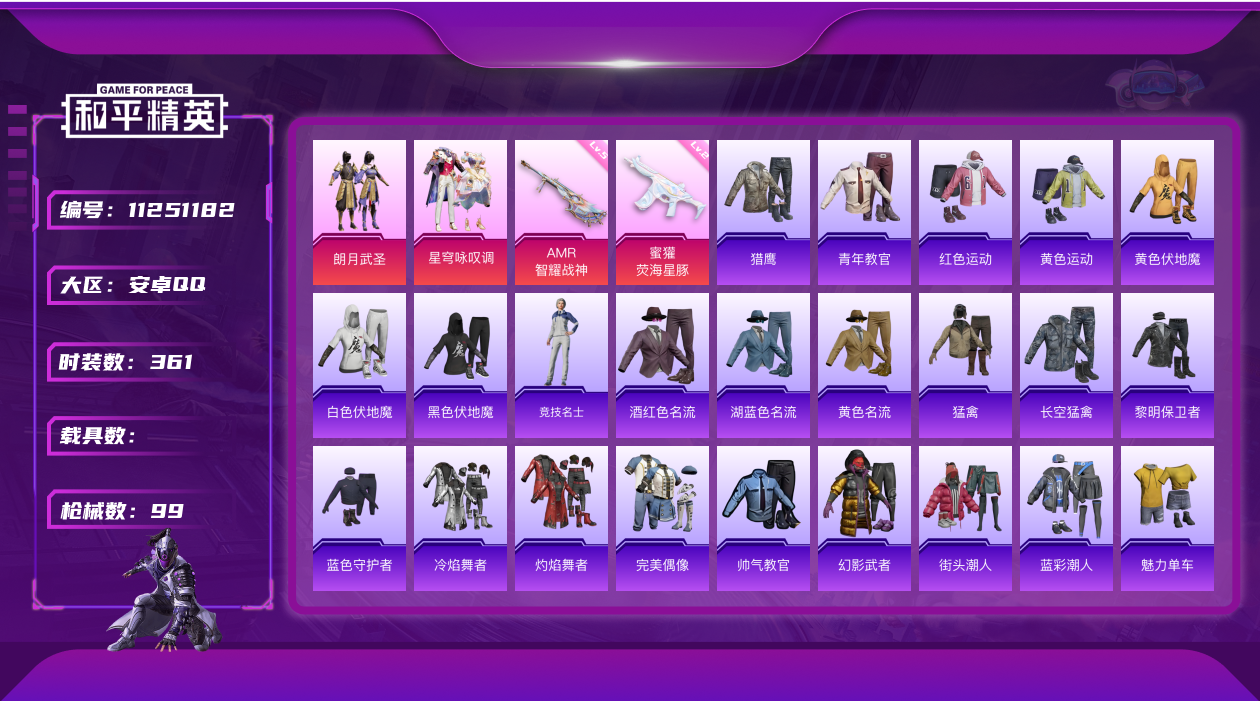 [11251182]2粉装 2特效枪 3印记 可二次 可修改实名 女号 优质装备:AMR-智耀战神,星穹咏叹调,蜜獾-荧海星豚 热门装扮:朗月武圣 五级特效枪:五级AMR-智耀战神 二级特效枪:二级蜜獾-荧海星豚 紫色装扮:SS22特训,龙舌兰冰茶,妙红点点,幻彩翩翩,SS23特训,娇憨猪猪,萌趣咩咩,SS21特训,绚烂繁星,SS30特训套装,冰川特警,冷焰舞者,青涩时光,霓虹热舞,极速光影,SS20特训,SS31特训套装,云朵鹅,雪绒豹,SS33特训套装,顶瓜瓜,虚音幻奏,SS19特训,竞技角斗士,香草威化,甜心亚梦,SS18特训,坚韧舞者,长空猛禽,都市漫游者,酒红色名流,霓虹街区,青年教官,青涩年华,缤纷果语,耀眼新星,荣耀,蓝彩潮人,蓝色守护者,街头潮人,魅力单车,麻辣教官,黄色伏地魔,黄色名流,黄色运动,黎明保卫者,黑色伏地魔,绮丽涂鸦,极地朋克,极速红龙,柠萌假日,深蓝色名流,湖蓝色名流,幻世战舞者,完美偶像,帅气教官,幻影武者,探宝勇士,白色伏地魔,破晓战魂,破蛋小黄鸡,王牌教练,空岛之星,竞技达人朋克,红色运动,猛禽,灼焰舞者,牛气冲天,猎鹰,牛气满满,白光莹,SS28特训,玉兔迎春,竞技名士,惊鸿侠骨,SS25特训,SS24特训(SS24特训套装),锦衣飞扬,SS27特训,小丑鱼,SS26特训,大橘大利,小鸟芋圆,耀粉歌者,SS32特训服(SS32特训套装),青玉碎影,萌黄之夏,白糯汤圆,光之冒险,红剪之缘 优质战备:炙焰牛王降落伞,荧海星豚降落伞,彩虹甜喵降落伞,仲夏莫吉托降落伞