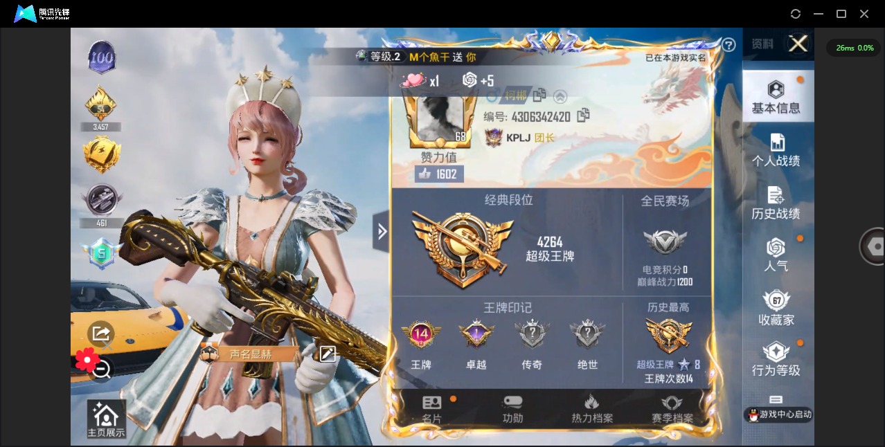 [11296202]4粉装 6特效枪 1载具 14印记 可二次 可修改实名 身法装备:暗影哥特(红眼罩) 优质装备:路特斯EVIJA(星际黄),AKM炫紫旋律,M416五爪金龙,奇异狩猎者,金风玉露,彗云及圣,AUG星之彼岸,七级AUG-星之彼岸,七级AKM-炫紫旋律,智耀战神,AMR-智耀战神,Kar98K-巳巳如意 热门装扮:筑梦精灵,神秘黑猫,仓鼠灰灰,鹰眼刺客,浪漫波比,好奇恐龙 稀有枪皮:DP-28-豹影疾电 六级特效枪:六级AMR-智耀战神 五级特效枪:五级Kar98K-巳巳如意,五级DP-28-豹影疾电 四级特效枪:四级M416-五爪金龙 紫色装扮:娇憨猪猪,萌趣咩咩,SS21特训,SS31特训套装,SS5特训,冰川特警,冷焰舞者,凛冬战士,刚毅裁决者,北国孤狼,旭日情侣,极速光影,SS30特训套装,SS33特训套装,顶瓜瓜,SS20特训,时空追击者,暴风机械师,SS16特训,冰爽风暴,SS13特训,骁骑迪迦,SS14特训,音速流光,SS19特训,军刀雅典娜,甜心亚梦,虚音幻奏,瑞龙福将,团圆交子,SS17特训,SS18特训,智慧隐士,都市漫游者,都市魅力,酷潮明星,长空猛禽,雨林探路者,雪山征服者,雪山精英,霓虹极客,霓虹街区,青春校园,缤纷果语,耀眼新星,荣耀,蓝彩潮人,蓝色运动,虎虎生威吉莉,街头潮人,跃动心情,魅力单车,黎明保卫者,黑色伏地魔,龙的传人,沙漠毒蛇,极地朋克,极速红龙,格斗先锋,棕色飞行服,沙漠兵团,暗金炫舞,海岛探路者,深蓝色名流,清新柠檬,滨海假日,圣诞大吉,坚韧舞者,夏日音浪,幻世战舞者,探宝勇士,滨海厨神,绮丽涂鸦,疯狂小兔子,白熊同盟,白色伏地魔,甜蜜告白,福星高照,竞技勇士朋克,竞技达人朋克,甜蜜熊情侣,潮流先锋,牛气冲天,灰色格斗者,热血青春,熔岩使者,牛气满满,特战装甲,SS29特训,星途旅人,光矢逐梦,异域银装,鱼渊荷华,玉兔迎春,燕燕于飞,巳巳如意,烈火街头,森林游猎者,竞技名士,暗影哥特(红眼罩),街头风暴,惊鸿侠骨,SS24特训(SS24特训套装),SS25特训,锦衣飞扬,粉红小猪,金羽特工,小丑鱼,SS26特训,智谋强哥,精神漫游,炽焰拳师,格斗专家,SS6特训,银河圣歌,闪耀星光,黑色刀锋,核芯基因,拳皇97八神庵,SS7特训,人鱼之吻,深蓝冒险家,迷域探索者,精密机核,摩艾涂鸦,SS8特训,大橘大利,SS12特训,众