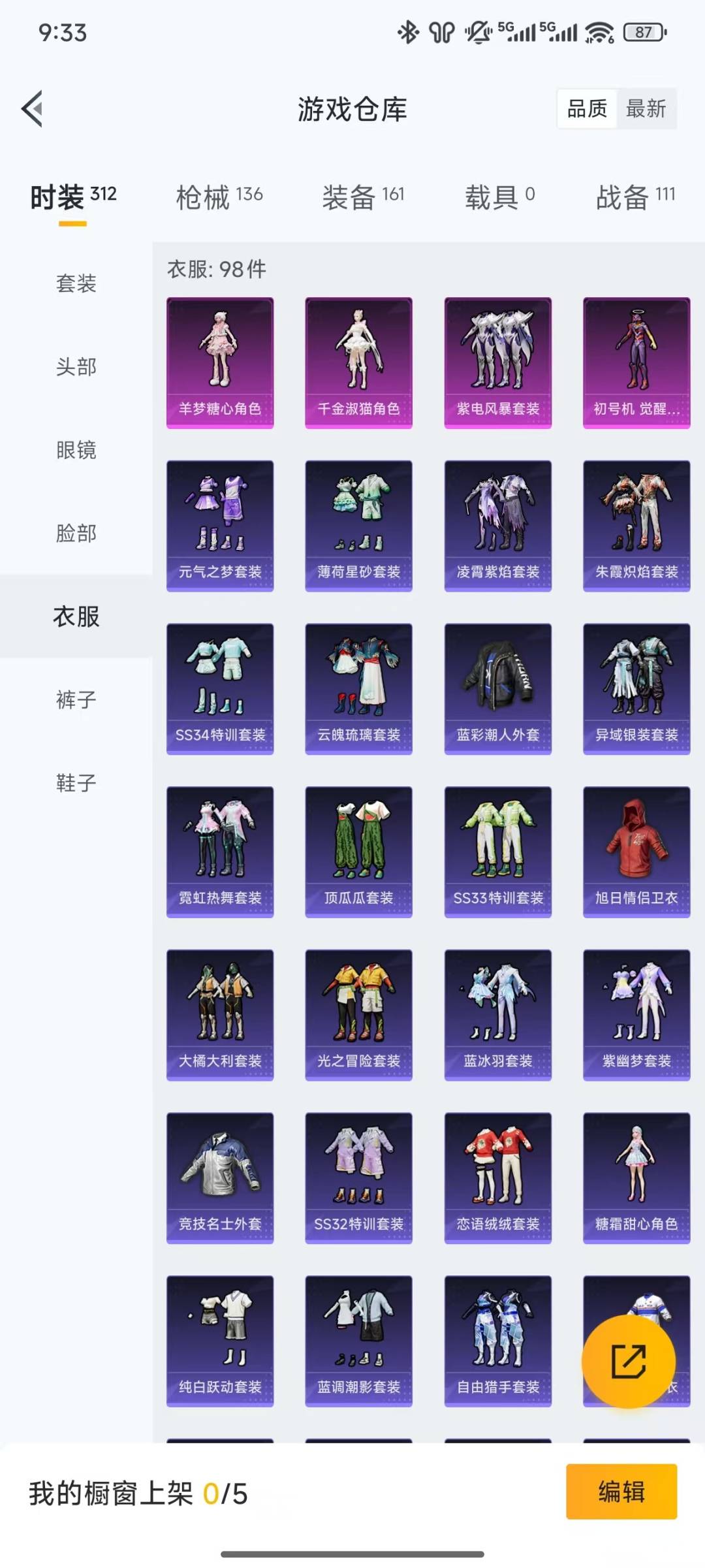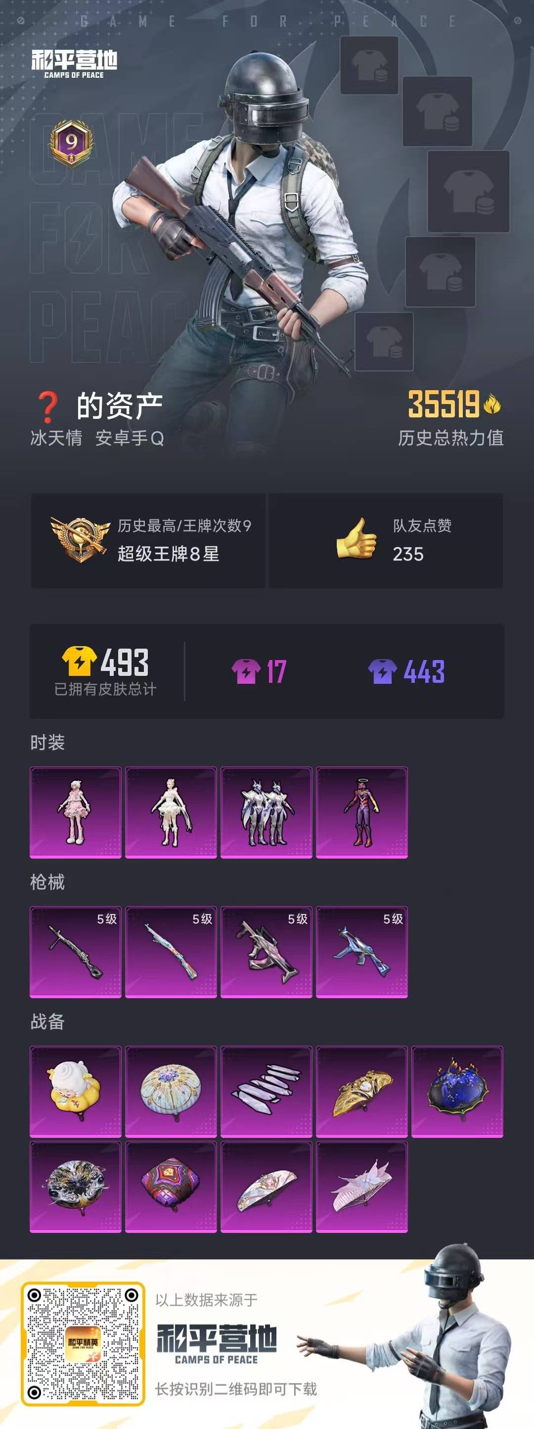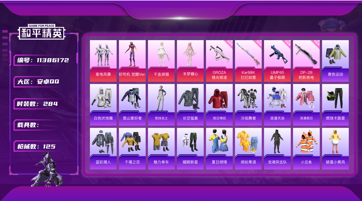 [11386172]4粉装 4特效枪 9印记 可二次 可修改实名 身法装备:初号机 觉醒Ver.(新紫螳螂),Mark.06(新蓝螳螂) 优质装备:UMP45量子极限,千金淑猫,GROZA-镜光银凌,羊梦糖心,Kar98K-巳巳如意 热门装扮:紫电风暴,初号机 觉醒Ver.(新紫螳螂) 稀有枪皮:DP-28-豹影疾电 五级特效枪:五级UMP45-量子极限,五级GROZA-镜光银凌,五级Kar98K-巳巳如意,五级DP-28-豹影疾电 紫色装扮:浪漫假日,SS31特训套装,冷焰舞者,千禧之恋,霓虹热舞,旭日情侣,SS33特训套装,顶瓜瓜,长空猛禽,霓虹街区,缤纷果语,耀眼新星,蓝彩潮人,魅力单车,黄色运动,龙的传人,龟仙人,冰河战士,龙魂突击队,蝶变,香桃花海,夏日倾情,登山爱好者,白色伏地魔,破蛋小黄鸡,空岛之星,燃烧卡路里,粉日山川,小熊娃娃,雏菊兔兔,萝兰蝴蝶,SS29特训,创世·幻影,纯真浪花,热情海星,SS28特训,卖崽青蛙,创世·追猎,奶油梦幻熊,Mark.06(新蓝螳螂),光矢逐梦,异域银装,鱼渊荷华,燕燕于飞,海琴烟,熊抱抱,青团波波,糖糖葫芦,棉花软糖,竞技名士,摩登魅猫,街头风暴,银尘,情公主,焰鹰斗篷,幻羽潜行,SS27特训,浪漫天命,小丑鱼,智谋强哥,大橘大利,蓝冰羽,紫幽梦,SS32特训服(SS32特训套装),绯格组合,自由猎手,纯白跃动,蓝调潮影,糖霜甜心,恋语绒绒,光之冒险 优质战备:墨龙九天降落伞,精灵梦叶罗丽降落伞,初号机 觉醒Ver.降落伞,江南烟雨降落伞,镜域双华-灵镜之阶,喜羊羊与灰太狼降落伞,鬼刀降落伞,金蛇镇世降落伞,智耀战神降落伞